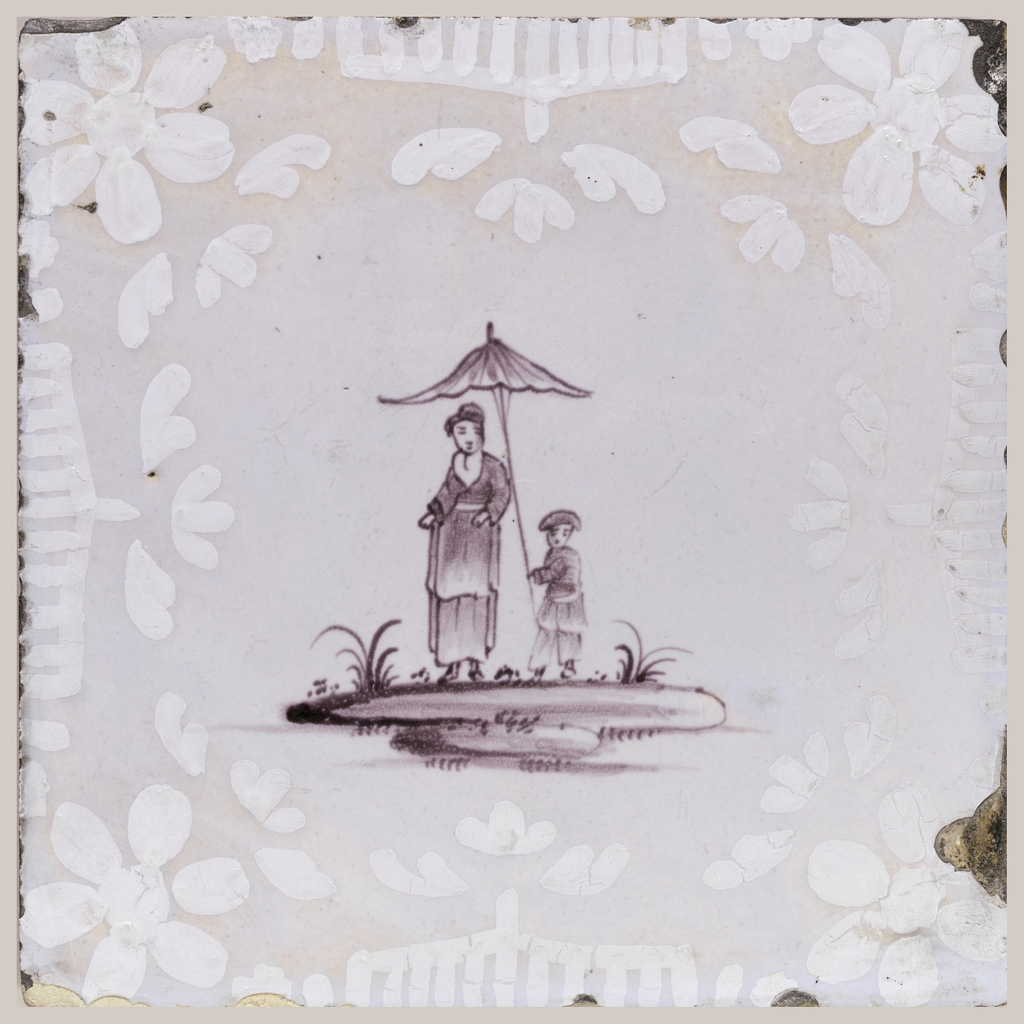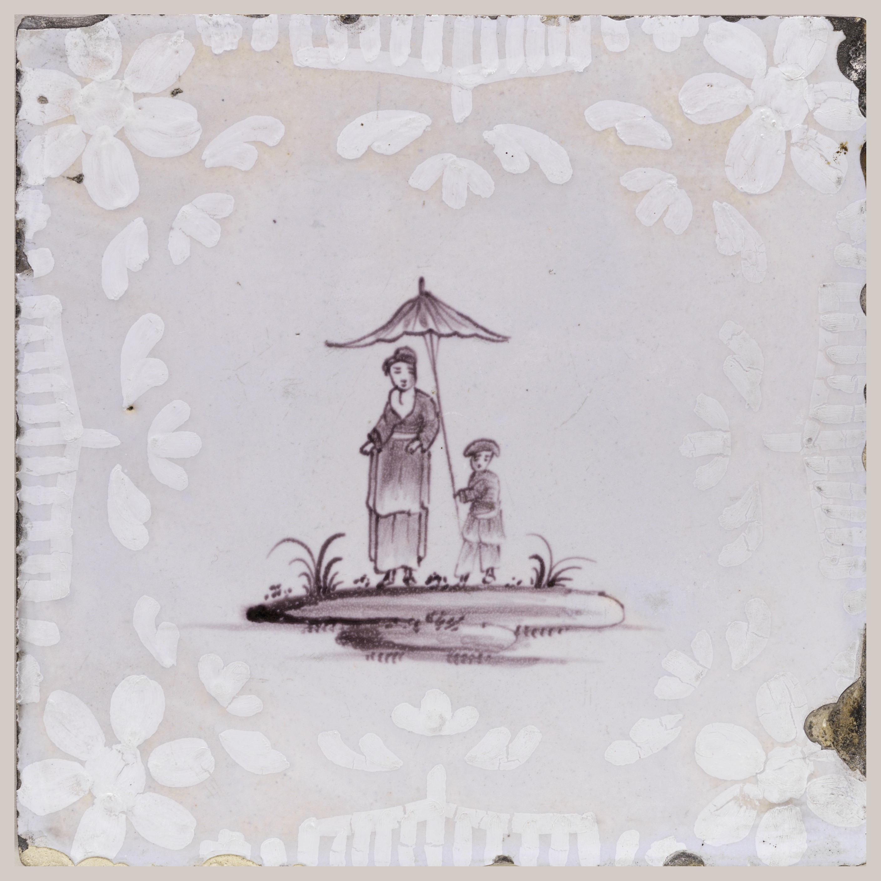 Tile (England); Painted by Michael Edkins (English, 1734 - 1811); Made by Joseph Fowler Factory; tin-enameled earthenware, underglaze manganese, overglaze white slip decoration; H x W x D (lying flat): 12.4 x 12.4 cm (4 7/8 x 4 7/8 in.); Museum purchase from Friends of the Museum Fund; 1938-12-2