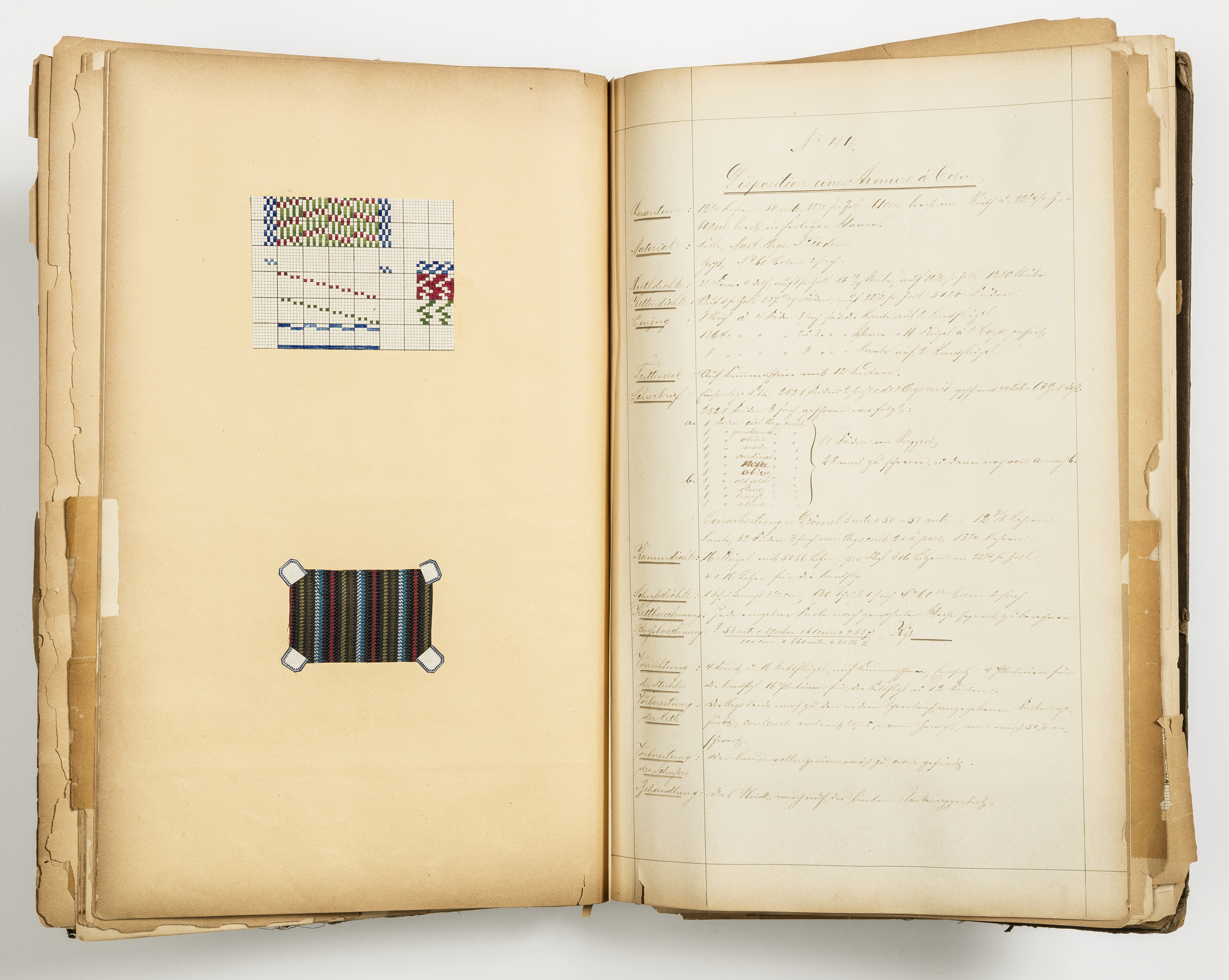 This is a Weaver's thesis book. It is dated 19th century and we acquired it in 1938. Its medium is buckram, paper. It is a part of the Textiles department.