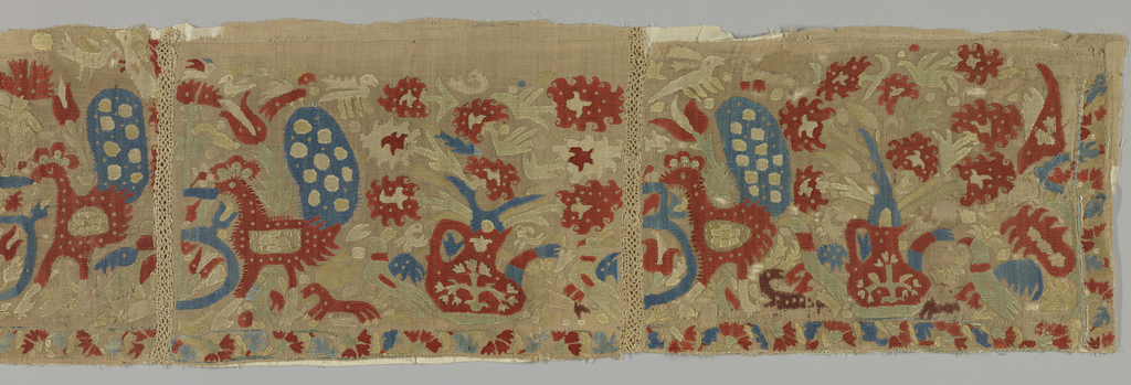 This is a Textile. It is dated 17th–18th century and we acquired it in 1938. Its medium is silk embroidery on linen foundation and its technique is embroidered on plain weave. It is a part of the Textiles department.