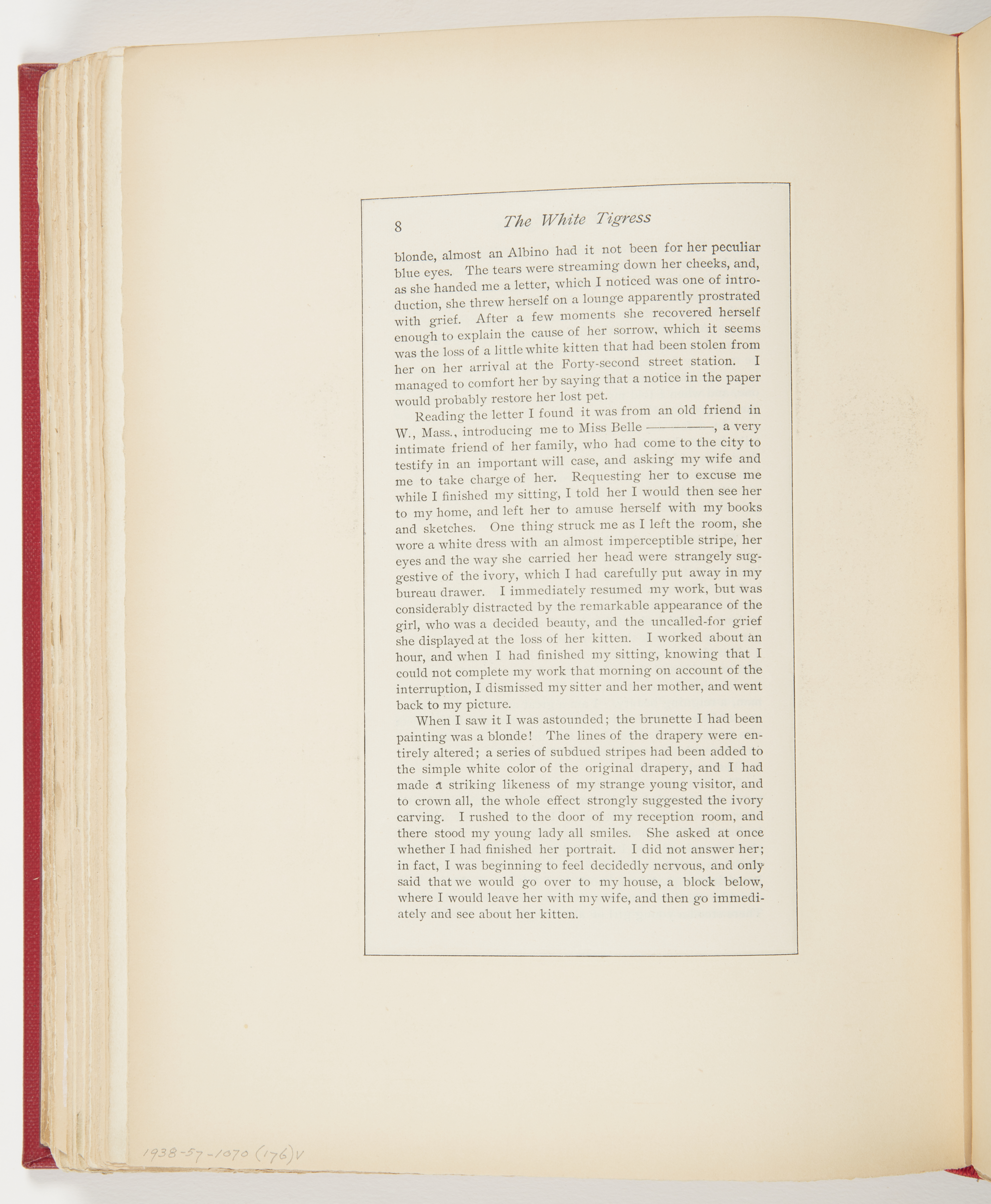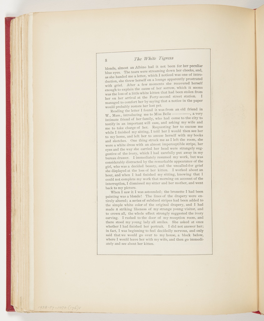 <ref name=CH>{{cite web |url=https://www-5.collection.cooperhewitt.org/objects/18346727/ |title=Ephemera, Excerpt from The White Tigress from Illustrations for Short Stories: A Magazine of Fact and Fiction (XIX, No. 1, May 1895, p. 8, 9) |author=Cooper Hewitt, Smithsonian Design Museum |accessdate=20 December 2025 |publisher=Smithsonian Institution}}</ref>