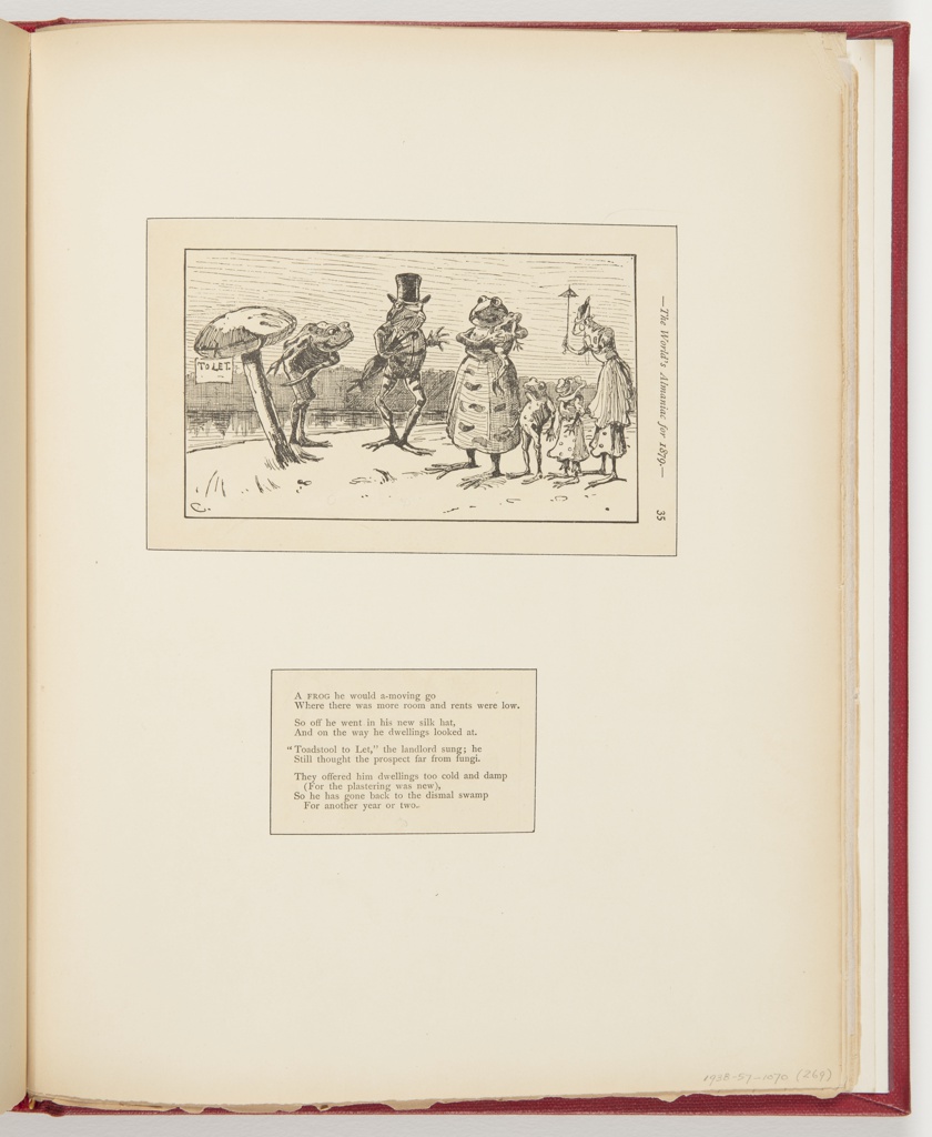 Ephemera, "A frog he would a-moving go," Illustration for and excerpt from The World's Almaniac for 1879: A Compendium of Useless and Interesting Information (p. 34, 35); Illustrated by Frederick Stuart Church (American, 1842–1924); Collected by Dr. Dudley Tenney (New York City); USA; Bequest of Erskine Hewitt; 1938-57-1070-269