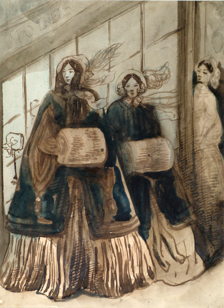 Drawing, The New Fashions; Designed by Constantin Guys (French, 1802 – 1892); France; pen and brown ink, brush and tan, blue and gray-blue washes over graphite on thin off-white wove paper; H x W: 25 × 18.3 cm (9 13/16 × 7 3/16 in.); Bequest of Erskine Hewitt; 1938-57-108