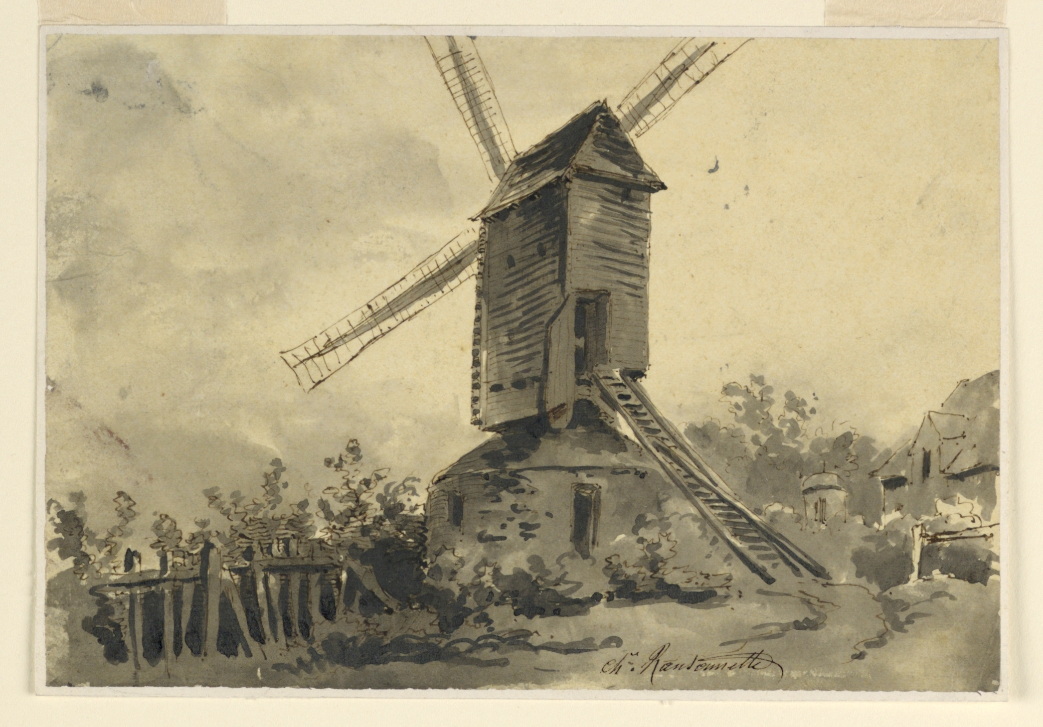 Drawing, A Windmill; Charles Nicolas Ransonnette (French, 1793 - 1877); France; pen and ink, brush and gray and brown watercolor, brush and chinese black on tissue paper; 11 × 16.2 cm (4 5/16 × 6 3/8 in.); Bequest of Erskine Hewitt; 1938-57-1099