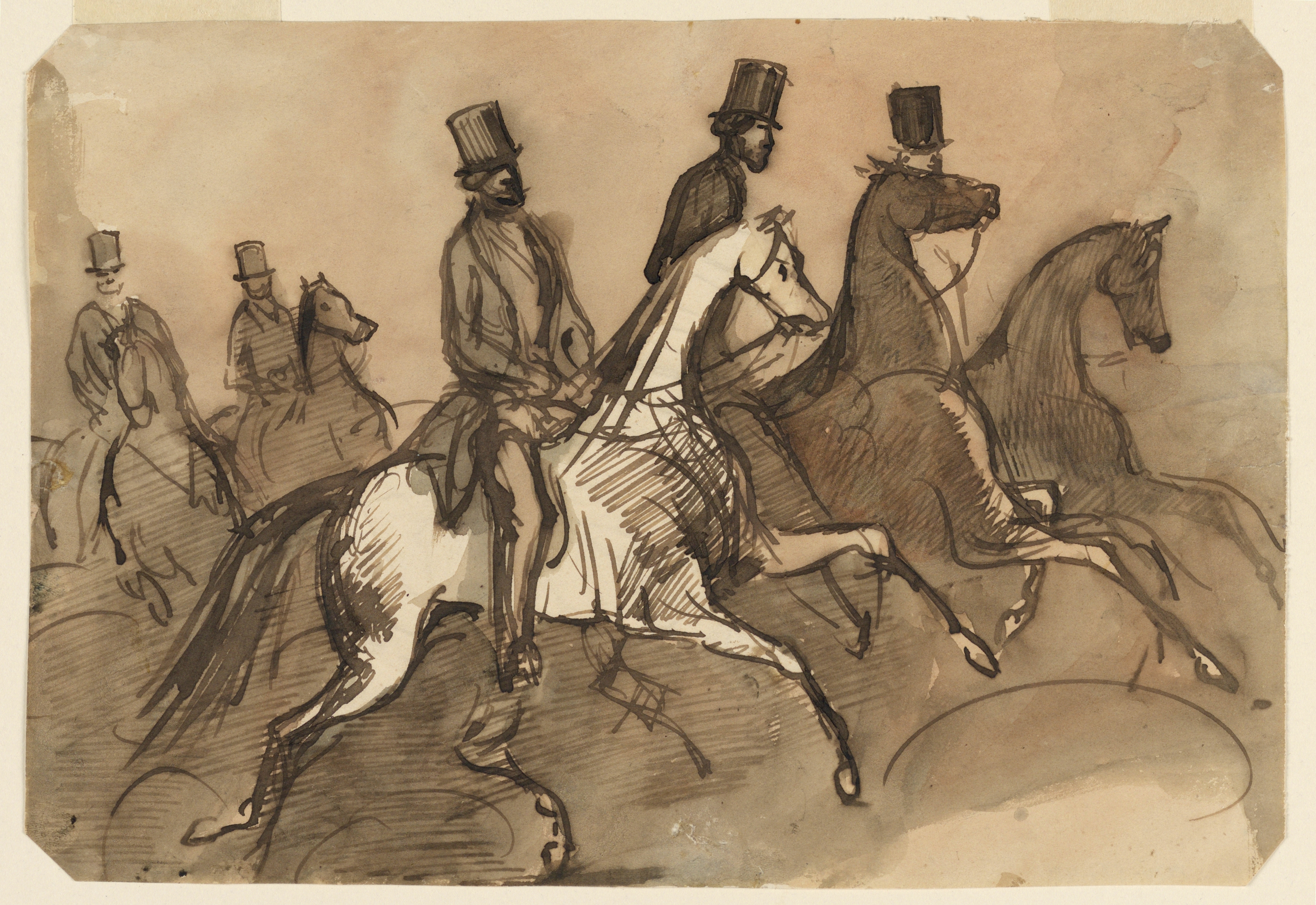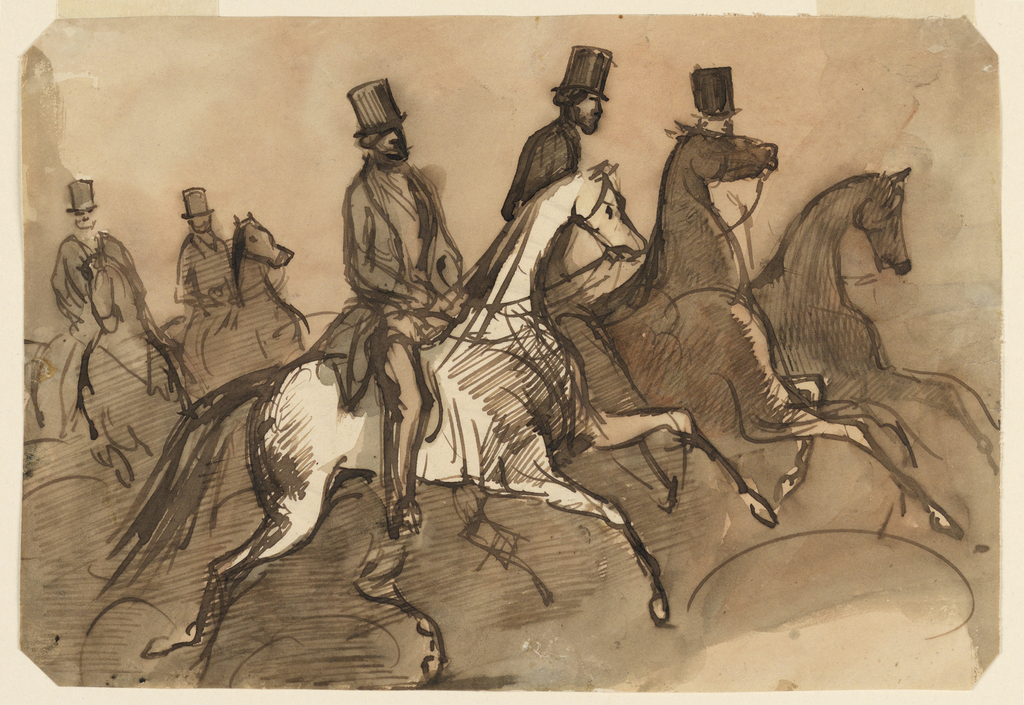 Drawing, Men on Horseback; Designed by Constantin Guys (French, 1802 – 1892); France; pen and brown ink, brush and tan wash on paper; H x W: 17.9 × 26.2 cm (7 1/16 × 10 5/16 in.); Bequest of Erskine Hewitt; 1938-57-115