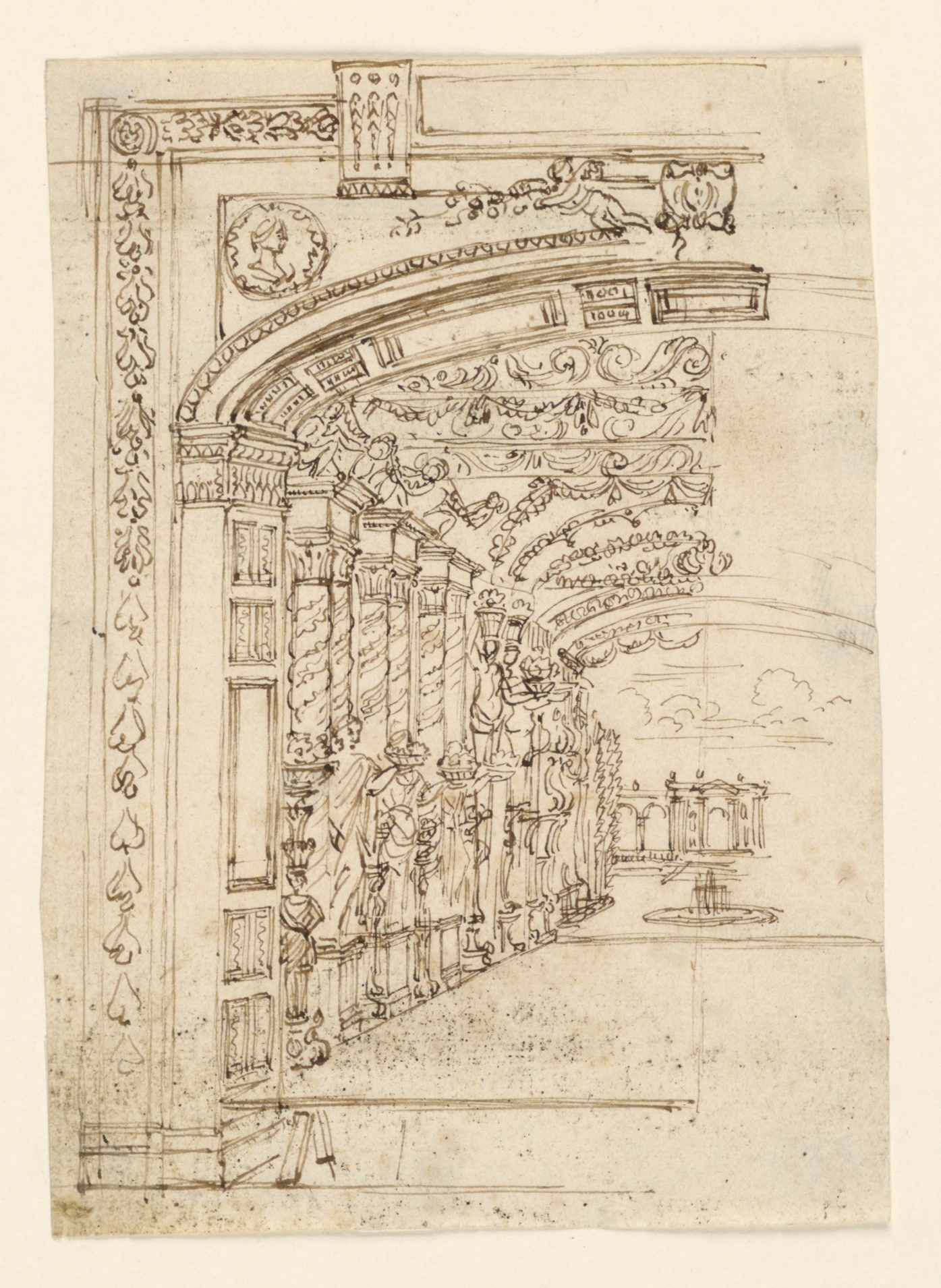 Drawing, Stage Design: Arcade Leading to a Garden; Italy; pen and brown ink on paper; 14.6 × 10.5 cm (5 3/4 × 4 1/8 in.); Bequest of Erskine Hewitt; 1938-57-1435