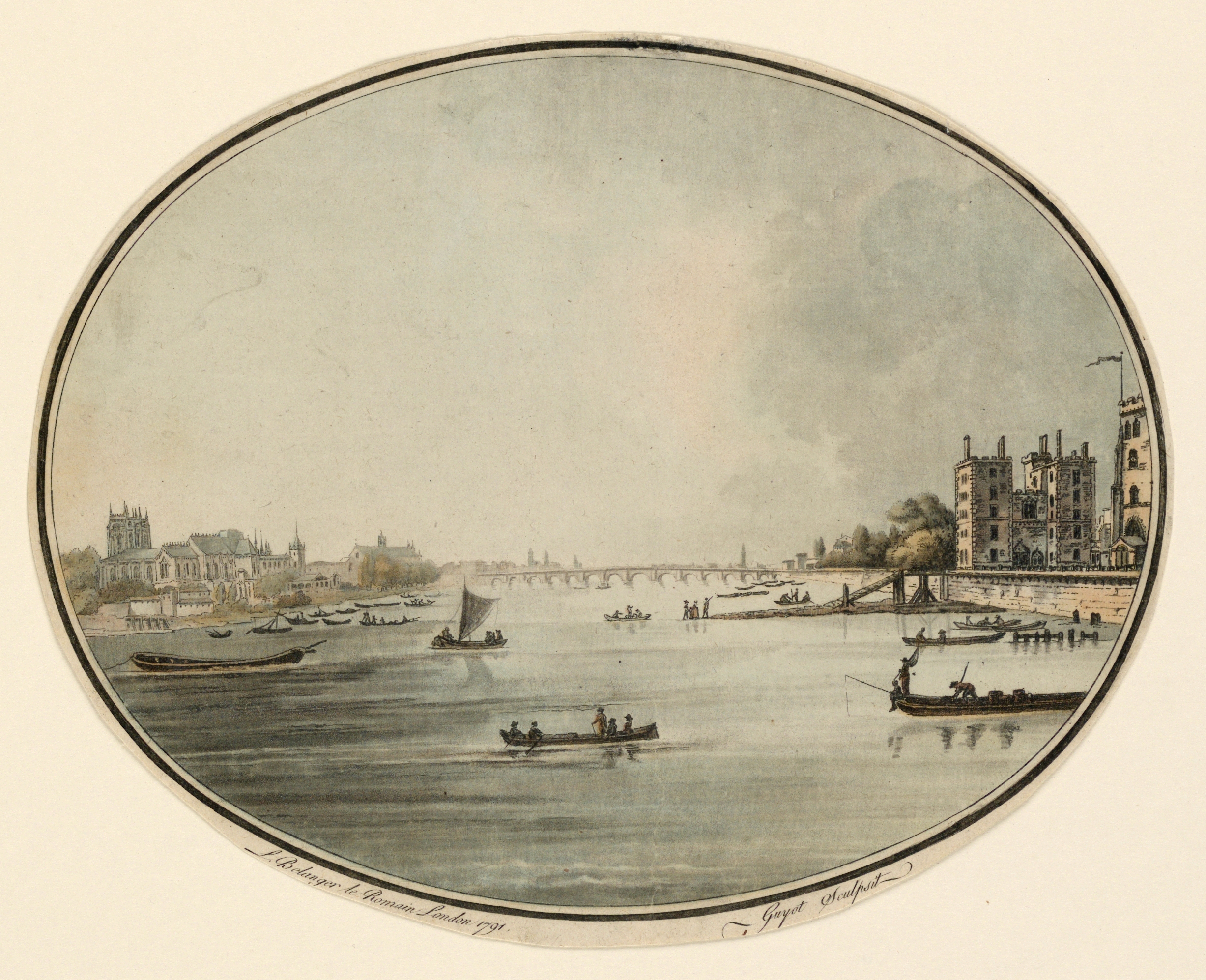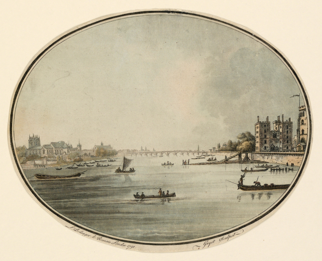 Print, View of London; Print Maker: Laurent Guyot (French, 1756 - 1808); France; color aquatint on paper; Bequest of Erskine Hewitt; 1938-57-185