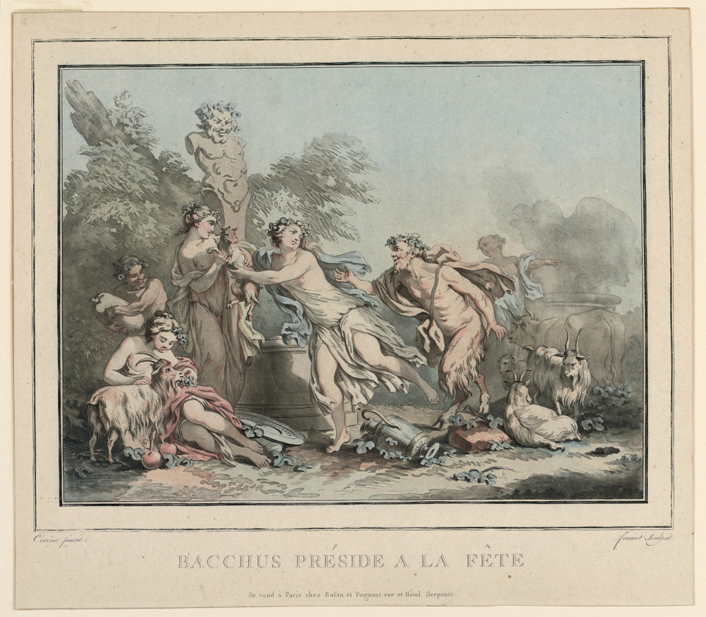 Print, Nymphs and Satyrs Before a Herm; Print Maker: Jean-François Janinet (French, 1752 - 1814); After Jacques-Philippe Caresme; France; color aquatint on paper; Bequest of Erskine Hewitt; 1938-57-189