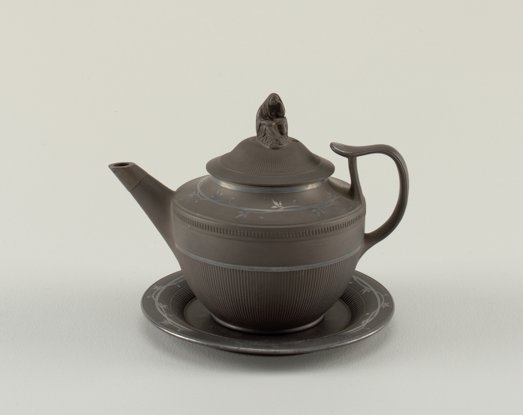 Dish; moulded and thrown unglazed stoneware (black basalt); teapot: 13.5 x 18 cm (5 5/16 x 7 1/16 in.) saucer: 1.5 x 15 cm (9/16 x 5 7/8 in.); Bequest of Erskine Hewitt; 1938-57-312-a/c