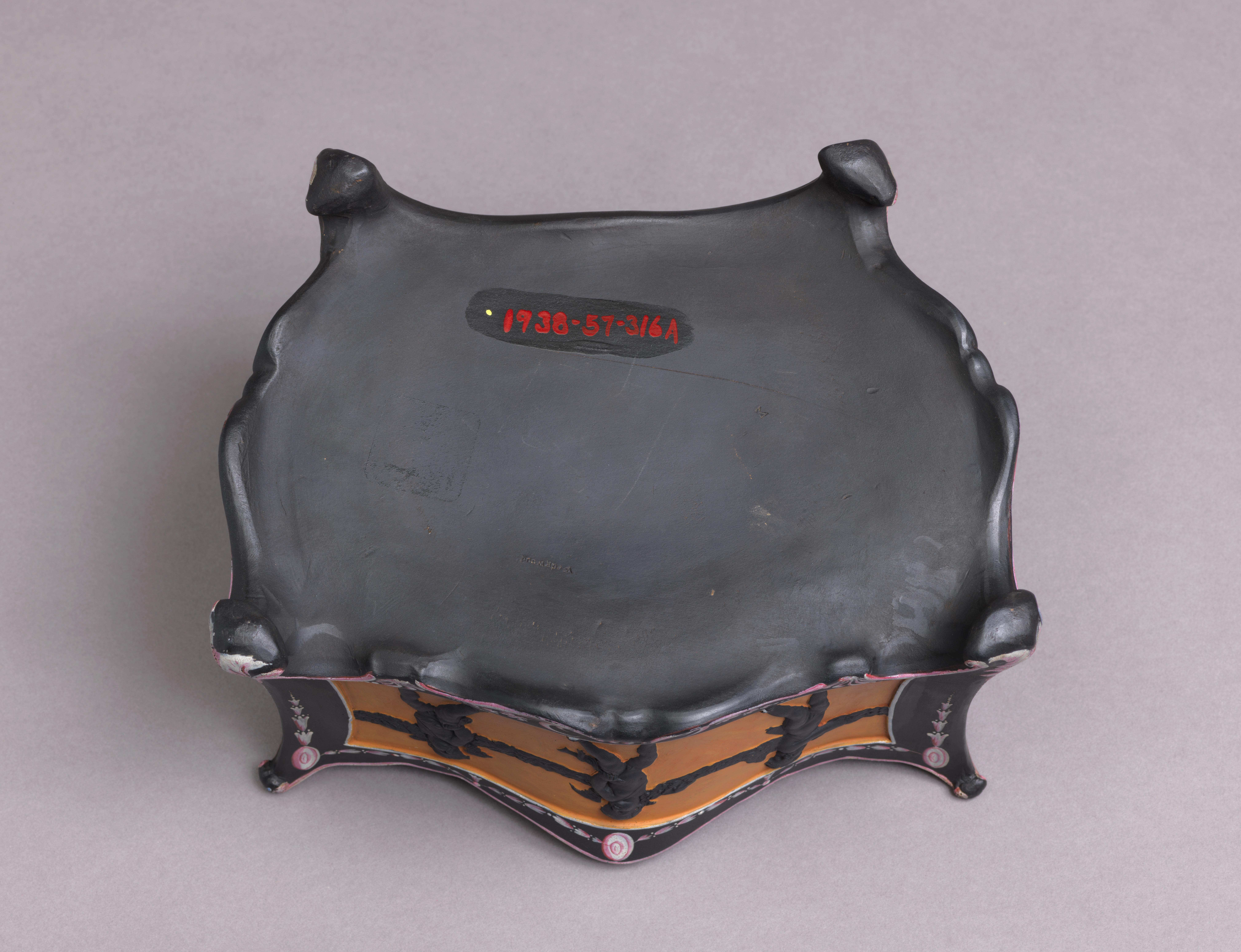 Black Basalt Bulb Pot Bulb Pot; Designed by John Flaxman (English, 1755 - 1826); Made by Wedgwood (United Kingdom); England; stoneware, enamel slip ('encaustic') decoration; H x W x D (a,b: overall): 14.4 × 21.1 × 16 cm (5 11/16 × 8 5/16 × 6 5/16 in.) H x W x D (a: pot): 14.4 × 21.1 × 16 cm (5 11/16 × 8 5/16 × 6 5/16 in.) H x W x D (b: removable collar): 3 × 17.1 × 13.5 cm (1 3/16 × 6 3/4 × 5 5/16 in.); Bequest of Erskine Hewitt; 1938-57-316-a,b