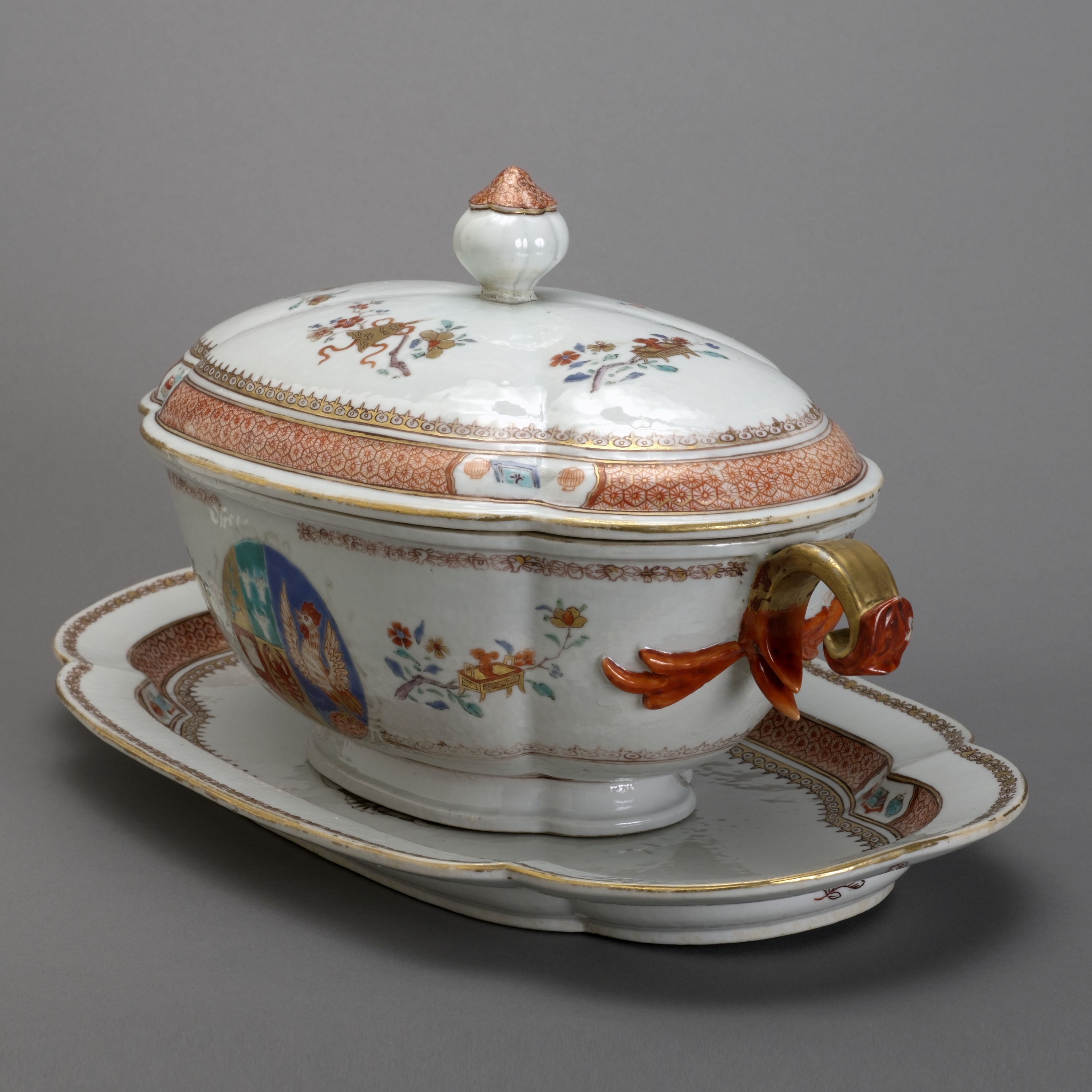 Soup Tureen with the Arms of the Scholten-Hogenberg Family Soup Tureen With Stand; Netherlands; porcelain, vitreous enamel, gold; H x W x D (a: tureen, b: cover): 18.6 x 36 x 18.3 cm (7 5/16 x 14 3/16 x 7 3/16 in.) H x W x D (c: stand): 3.2 x 36.3 x 21.2 cm (1 1/4 x 14 5/16 x 8 3/8 in.); Bequest of Erskine Hewitt; 1938-57-354-a/c