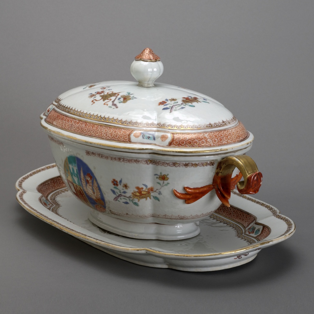 This tureen represents a primary focus in the early collecting of Asian objects: Chinese export ceramics. Erskine, one of Sarah and Eleanor’s brothers, may have collected the tureen for its unusual cartouche, which research has since discovered to be the “coat of arms” for an 18th-century family of Dutch grocers.
