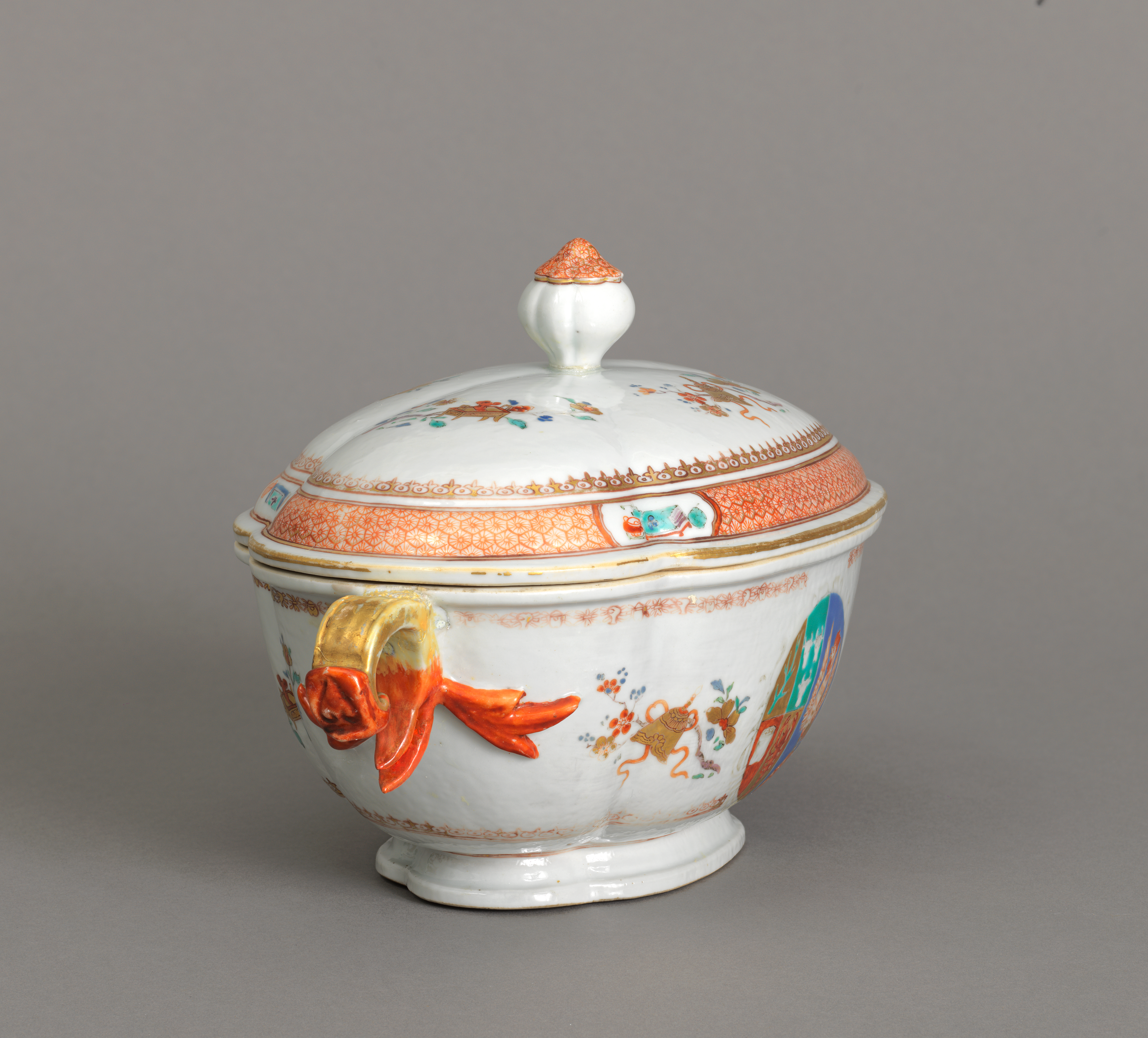This tureen represents a primary focus in the early collecting of Asian objects: Chinese export ceramics. Erskine, one of Sarah and Eleanor’s brothers, may have collected the tureen for its unusual cartouche, which research has since discovered to be the “coat of arms” for an 18th-century family of Dutch grocers.