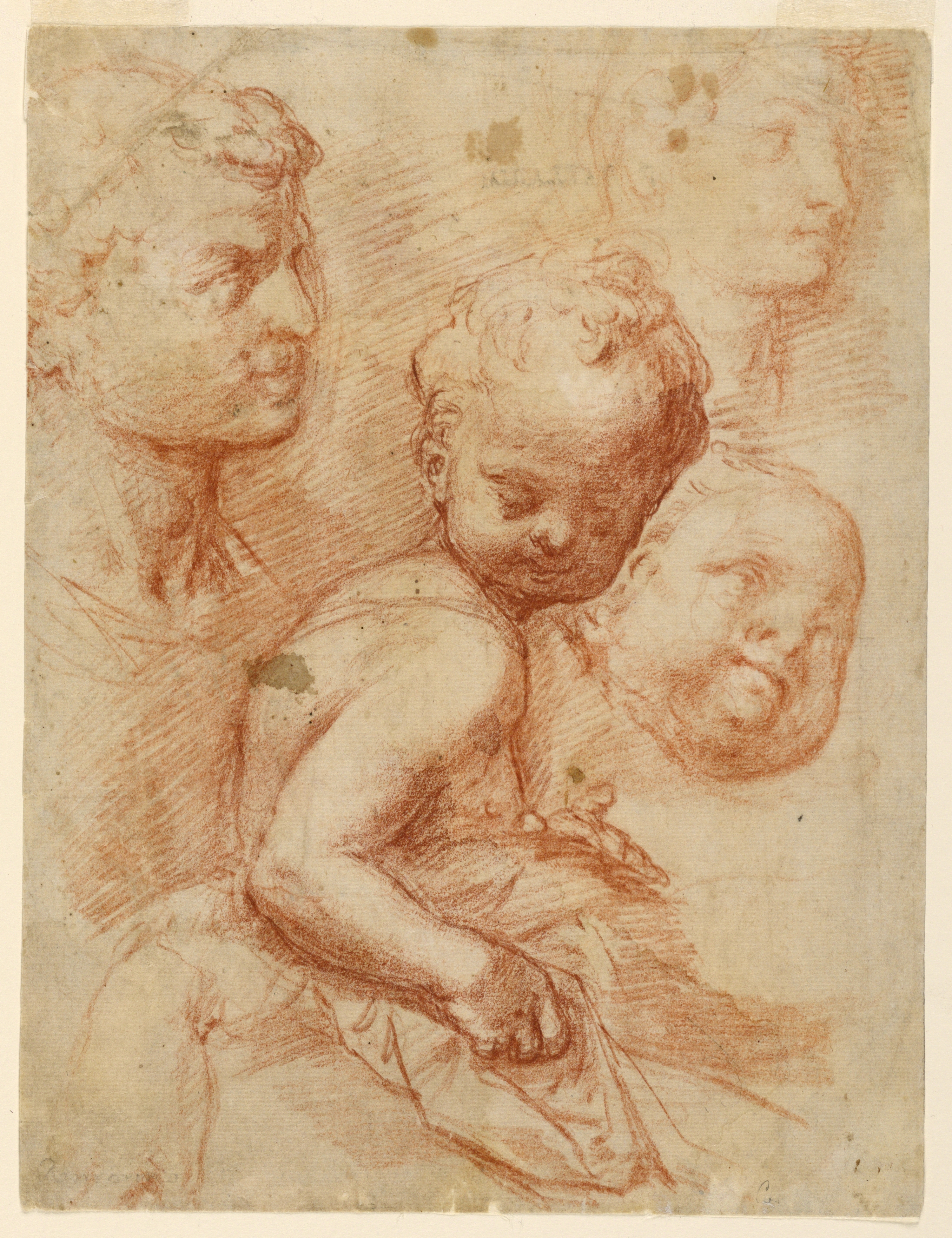 Drawing, Study of man, woman and child heads, sitting child; Giovanni Battista Naldini (Italian, 1537 - 1591); Italy; red chalk on light brown paper; 21.5 x 28.4 cm (8 7/16 x 11 3/16 in.); Bequest of Erskine Hewitt; 1938-57-928