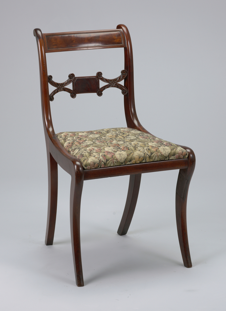 This is a chair. It was made by John Hewitt. It is dated ca. 1820 and we acquired it in 1938. Its medium is wood (mahogany and poplar), horse hair. It is a part of the Product Design and Decorative Arts department.