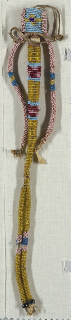 This is a Doll or fetish figure. It is dated late 19th–early 20th century and we acquired it in 1938. Its medium is glass beads, leather and its technique is embroidery with beads. It is a part of the Textiles department.
