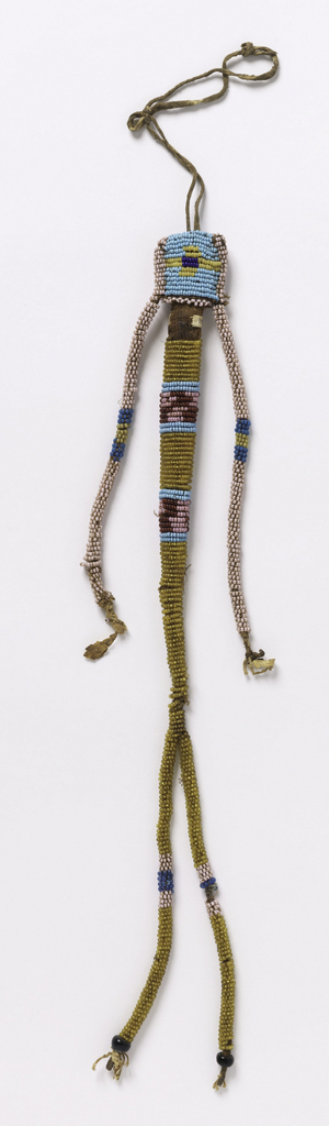 This is a Doll or fetish figure. It is dated late 19th–early 20th century and we acquired it in 1938. Its medium is glass beads, leather and its technique is embroidery with beads. It is a part of the Textiles department.