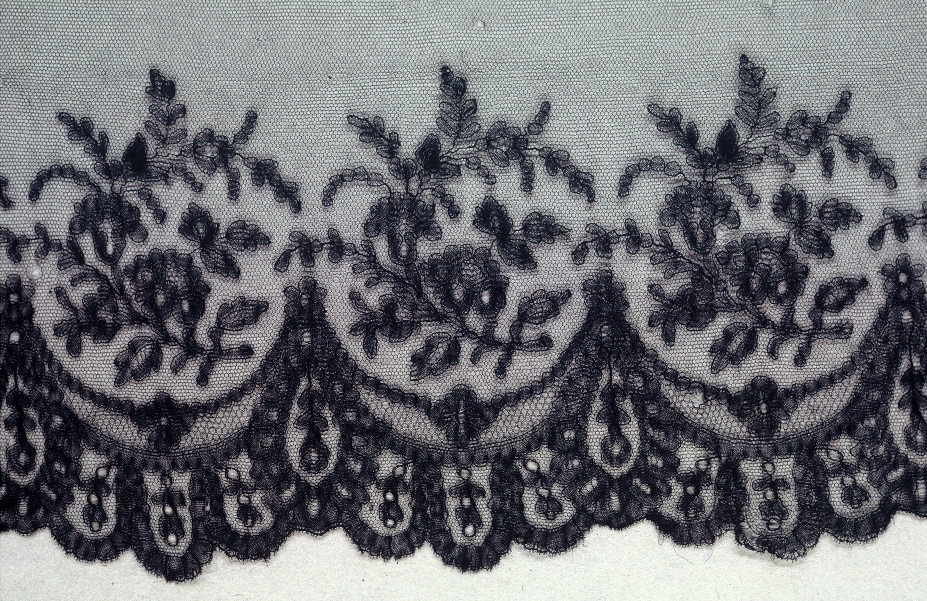 This is a Edging. It is dated 19th century and we acquired it in 1938. Its medium is linen and its technique is bobbin lace, chantilly style. It is a part of the Textiles department.