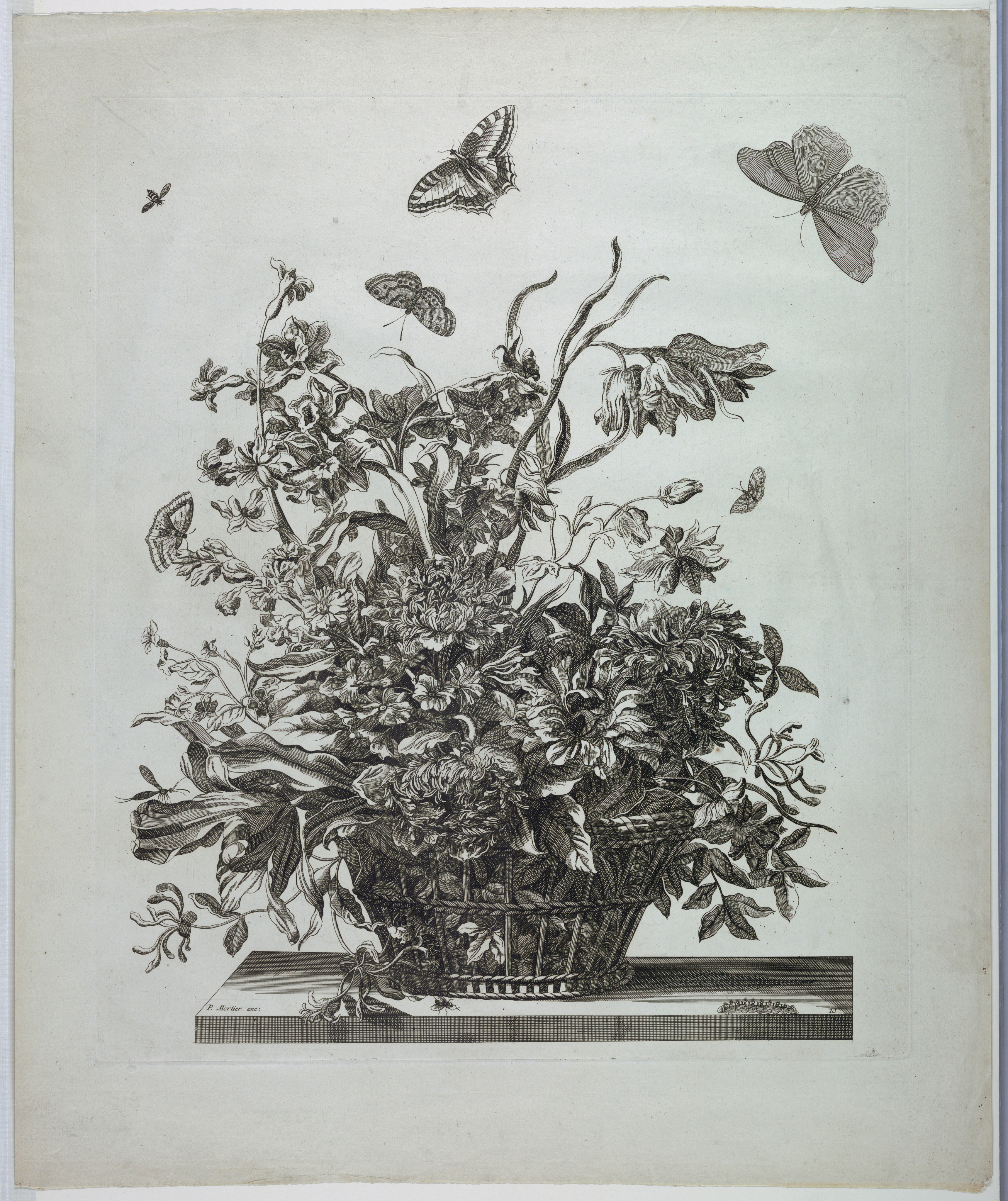 Jean-Baptiste Monnoyer (French, 1626-1699 ), a painter, designer and engraver, created many prints like this work, Plate 10 from Set of Flowers in a Basket which is dated to 1680. Early flower prints were primarily used for botanical textbooks, but by the end of the seventeenth century, they were considered a higher artistic medium. Prints like this work would have been etched and then colored by hand and often re-purposed for wallpapers, toiles and chintzes.[1] In Plate 10, peonies, tulips, narcissi, and anemones overflow from the basket, while four butterflies and other insects surround. The detail and delicacy of the flowers display Monnoyer’s dexterous skill with both the medium and the subject. Each petal and leaf is distinct, allowing the viewer to recognize the unique natural forms and immerse himself in the flora. Monnoyer often mixed autumn and spring flowers in his designs, seemingly unconcerned with the realism of their synchronicity.[2] These combinations create a magical, effervescent semblance, reflecting the lighthearted, fluid motifs that emerged out of the early Rococo era.