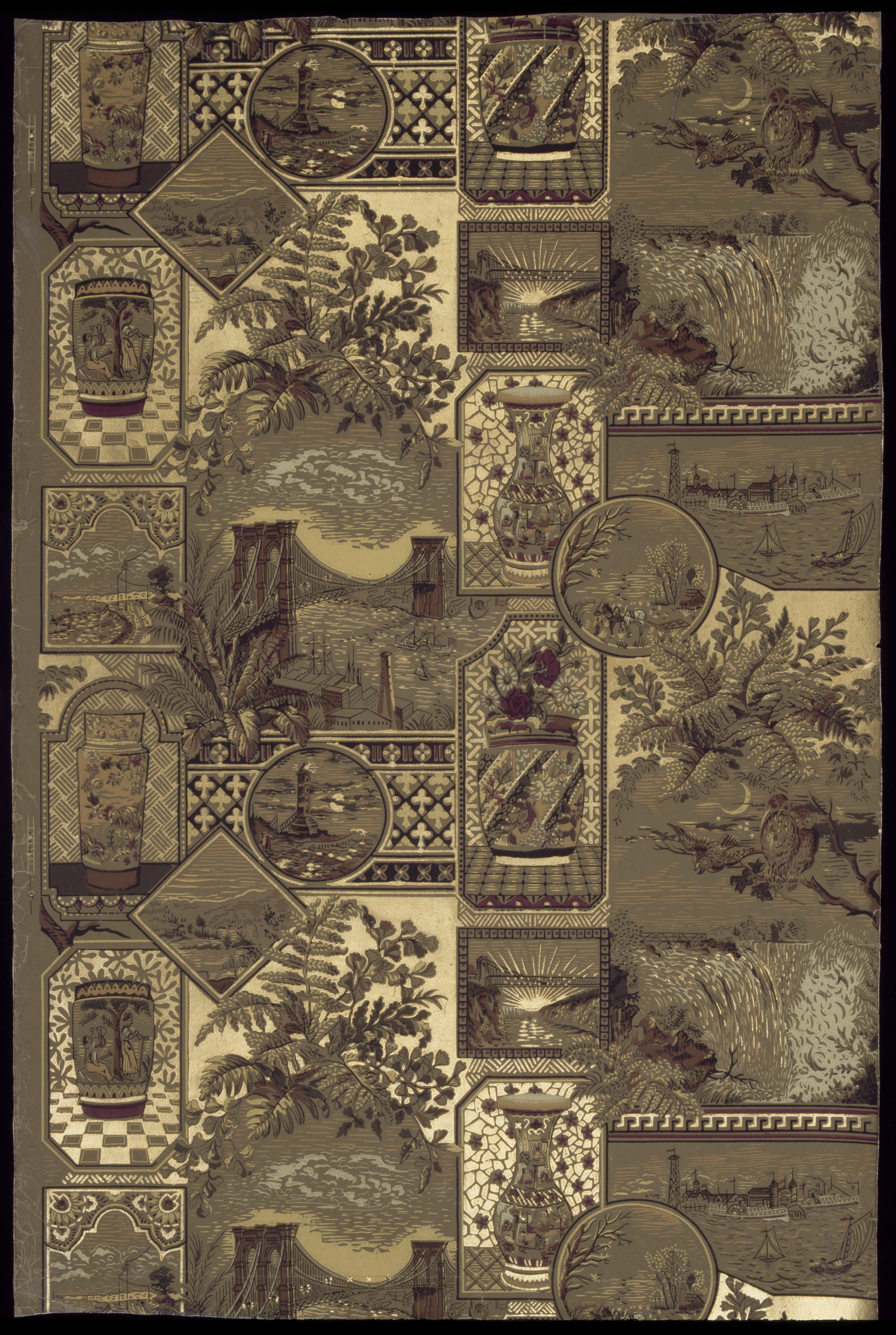 Anglo-Japanese wallcoverings, composed of tightly patterned circles, squares, and rectangles filled with ornament and arranged asymmetrically, became the vogue for walls and ceilings of parlors and libraries during the 1880s. This example, combining images of Niagara Falls as well as the Niagara Railroad Suspension Bridge and the Brooklyn Bridge (both designed by John Augustus Roebling), appears to celebrate man’s ability to harness the power of natural forces and materials to create new technologies such as cast-iron bridges.