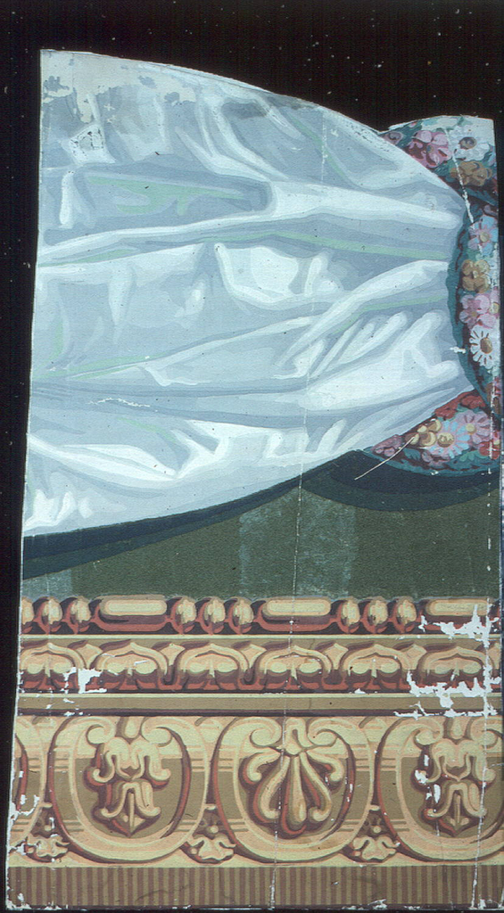 This is a Border. It was manufactured by Dufour et Leroy. It is dated 1810–15 and we acquired it in 1938. Its medium is block-printed and flocked on handmade paper. It is a part of the Wallcoverings department.