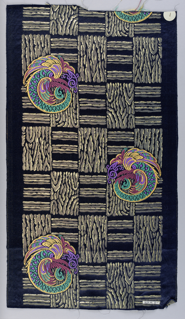 This is a Ribbons. It is dated ca. 1919 and we acquired it in 1938. Its medium is silk, metallic thread and its technique is compound satin weave with supplementary weft. It is a part of the Textiles department.
