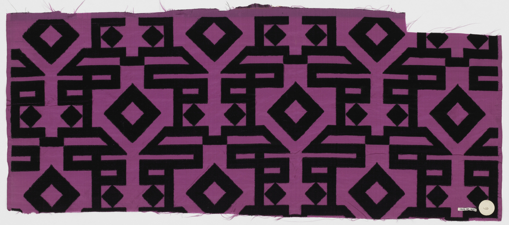 This is a Sample. It is dated ca. 1925 and we acquired it in 1938. Its medium is silk and its technique is cut and voided supplementary warp pile (velvet) in a taffeta ground. It is a part of the Textiles department.