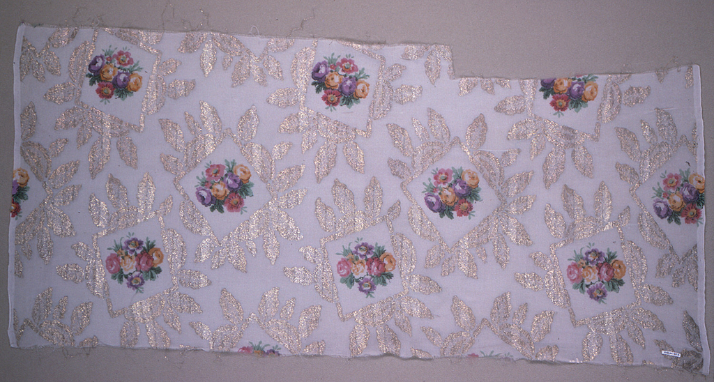 This is a Textile. It is dated ca. 1919 and we acquired it in 1938. Its medium is silk, metallic thread and its technique is printed on plain weave with supplementary weft. It is a part of the Textiles department.