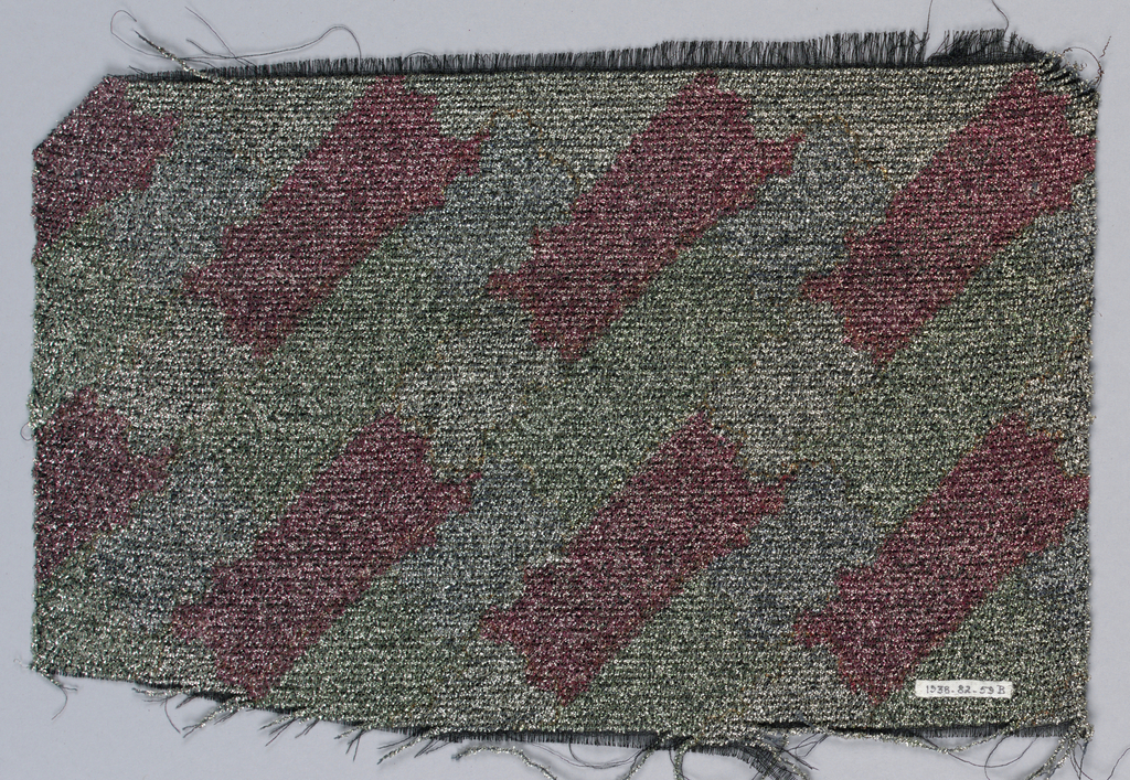 This is a Trimming. It is dated ca. 1925 and we acquired it in 1938. Its medium is cotton, metallic thread and its technique is printed on compound twill weave with supplementary weft. It is a part of the Textiles department.