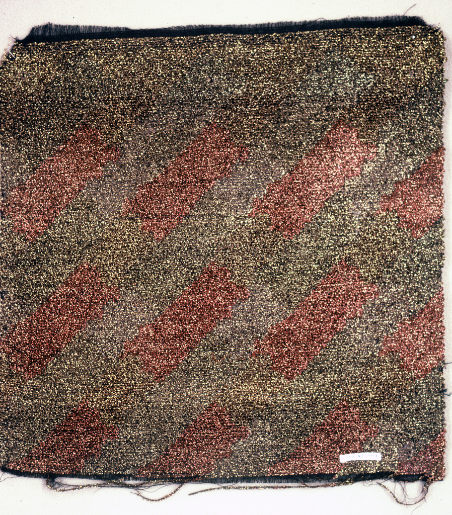 This is a Trimming. It is dated ca. 1925 and we acquired it in 1938. Its medium is cotton, metallic thread and its technique is printed on compound twill weave with supplementary weft. It is a part of the Textiles department.