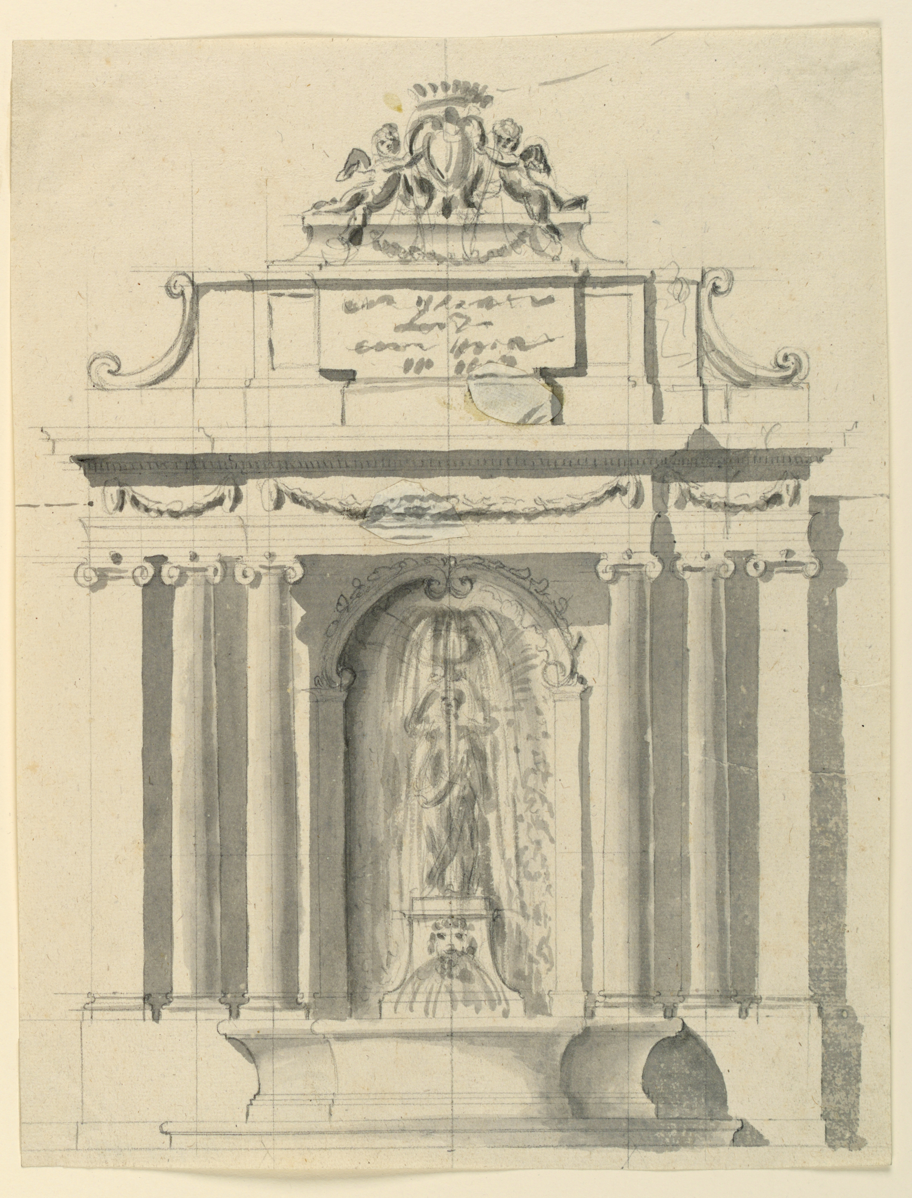 Drawing, Wall Fountain; Architect: Giuseppe Valadier (Italian, 1762–1839); Italy; graphite, brush and gray wash on laid paper; 33.5 x 25.9 cm (13 3/16 x 10 3/16 in.) Mat: 45.7 x 35.6 cm (18 x 14 in.); Museum purchase through gift of various donors and from Eleanor G. Hewitt Fund; 1938-88-1013