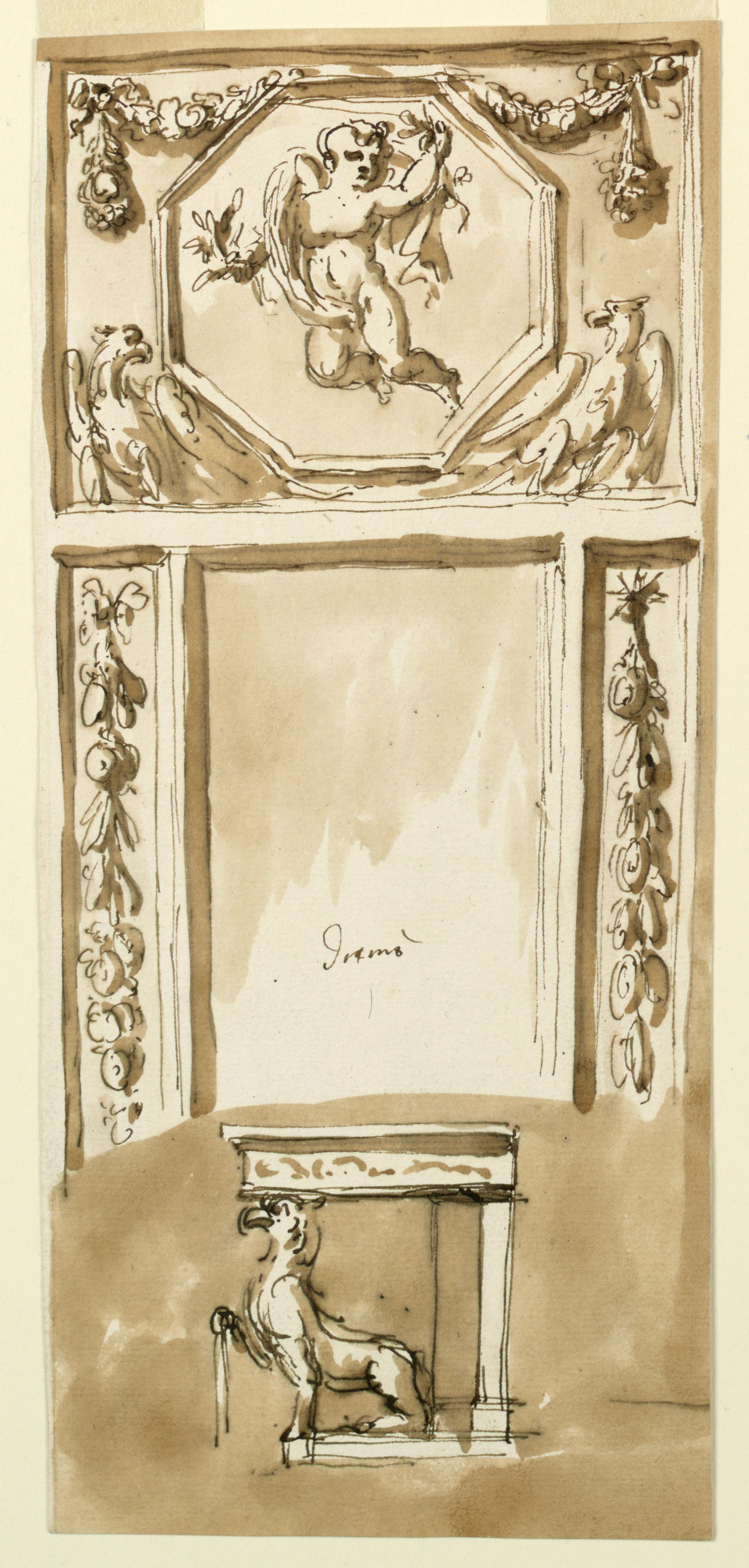 Drawing, Design for a Console Table and Looking Glass; Designed by Giuseppe Barberi (Italian, 1746–1809); Italy; pen and brown ink, brush and brown wash on lined off-white laid paper; 25.8 x 11.5 cm (10 3/16 x 4 1/2 in.); Museum purchase through gift of various donors and from Eleanor G. Hewitt Fund; 1938-88-1043