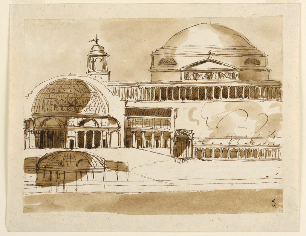 This is a Drawing. It was designed by Giuseppe Barberi and architect: Giuseppe Barberi. It is dated 1795 and we acquired it in 1938. Its medium is pen and brown ink, brush and brown wash, red pencil on lined off-white laid paper. It is a part of the Drawings, Prints, and Graphic Design department.