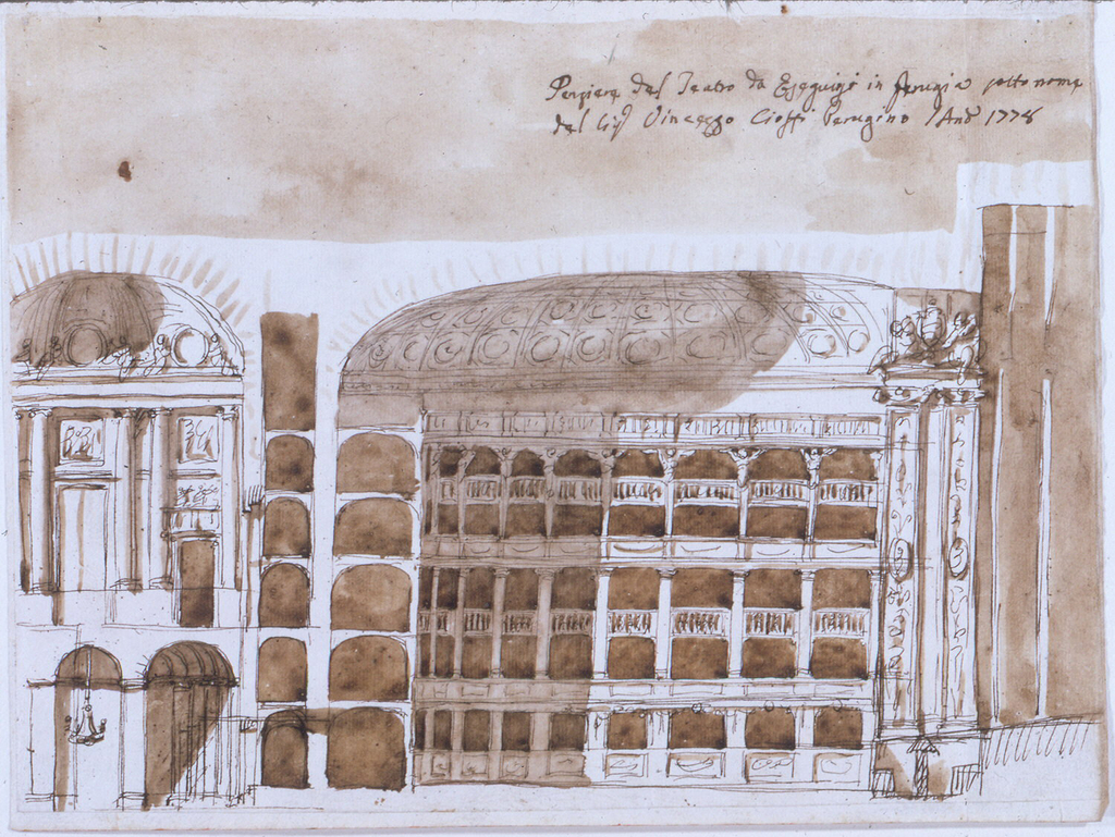 Inscribed in black ink, upper margin: Pensiere del Teatro da eseguirsi in Perugia sotto nome/ del Sig. Vincenzo Cioffi Perugino l'Ano 1778. (Trans: Idea of how to execute decoration at Theatre at Perugia under the name of Signor Vincenzo Cioffi of Perugia, 1778)