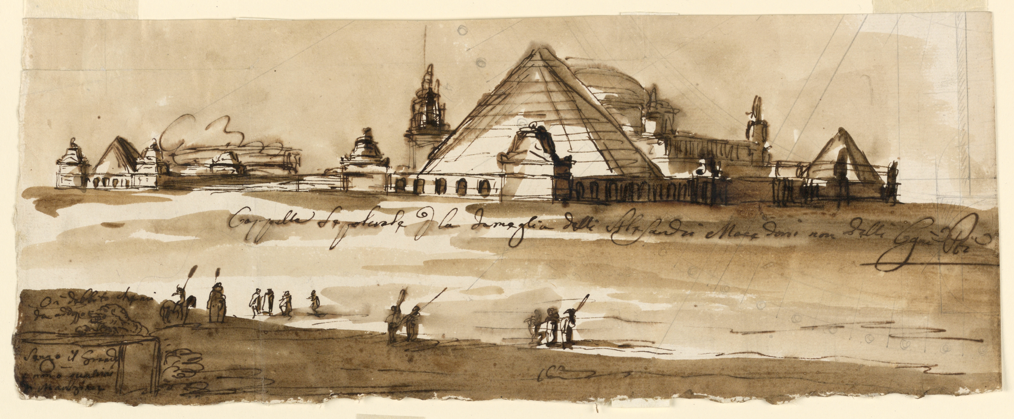 Drawing, Mausoleum for family of Alexander the Great; Designed by Giuseppe Barberi (Italian, 1746–1809); Italy; pen and brown ink, brush and brown wash, graphite on off-white laid paper, lined; Image: 15.2 x 39.1 cm (6 x 15 3/8 in.); Museum purchase through gift of various donors and from Eleanor G. Hewitt Fund; 1938-88-1178
