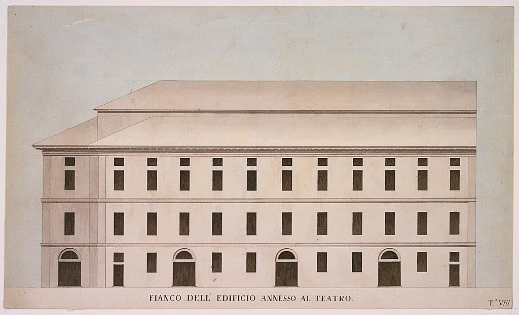 Inscription: FIANCO DELL'EDIFCIO ANNESSO AL TEATRO.; at lower right, T. ˆ VIII