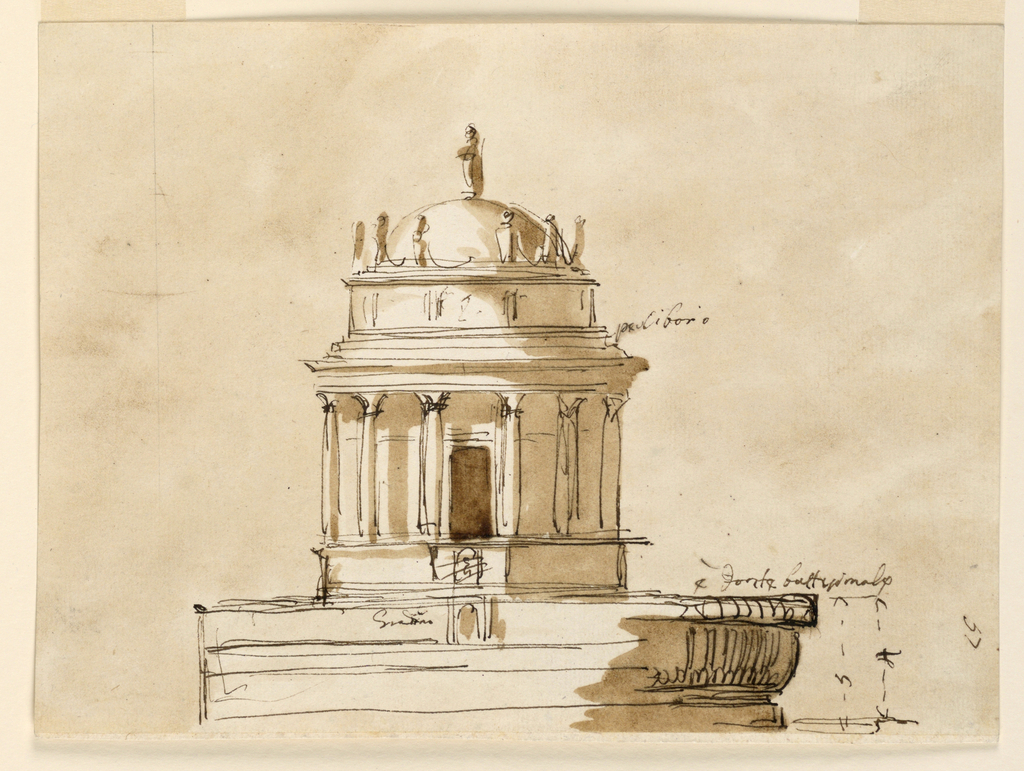 Drawing, Design for a Tabernacle and a Baptismal Font; Designed by Giuseppe Barberi (Italian, 1746–1809); Italy; pen and brown ink, brush and brown wash, graphite on lined off-white laid paper; 18.3 x 25 cm (7 3/16 x 9 13/16 in.); Museum purchase through gift of various donors and from Eleanor G. Hewitt Fund; 1938-88-1389
