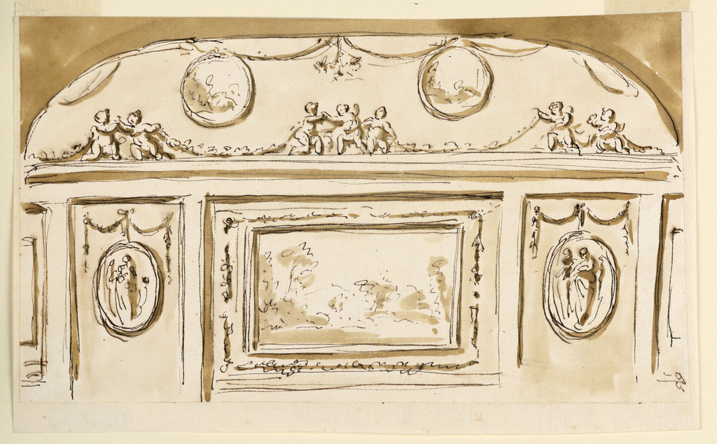 Drawing, Wall Elevation with Swags and Medallions; Designed by Giuseppe Barberi (Italian, 1746–1809); Italy; pen and brown ink, brush and brown wash on off-white laid paper, lined; Image: 15.8 x 27.5 cm (6 1/4 x 10 13/16 in.); Museum purchase through gift of various donors and from Eleanor G. Hewitt Fund; 1938-88-1513