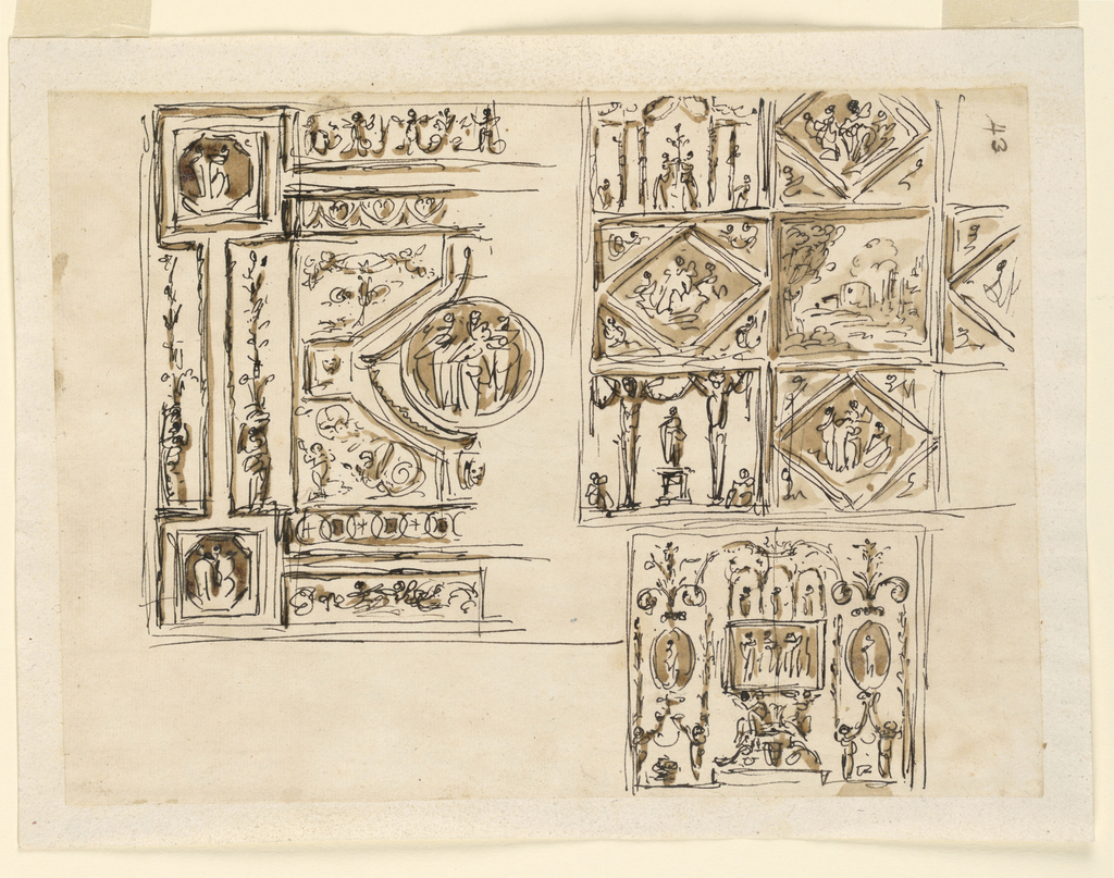 Drawing, Design for Ceiling Decoration; Designed by Giuseppe Barberi (Italian, 1746–1809); Italy; pen and brown ink, brush and brown wash on off-white laid paper, lined; Image: 20.1 x 27.4 cm (7 15/16 x 10 13/16 in.); Museum purchase through gift of various donors and from Eleanor G. Hewitt Fund; 1938-88-1517
