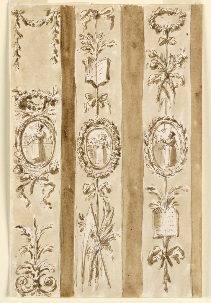 Drawing, Designs for Decorated Pilasters; Designed by Giuseppe Barberi (Italian, 1746–1809); Italy; pen and brown ink, brush and brown wash on off-white laid paper, lined; Image: 27.1 x 17.7 cm (10 11/16 x 6 15/16 in.); Museum purchase through gift of various donors and from Eleanor G. Hewitt Fund; 1938-88-1546