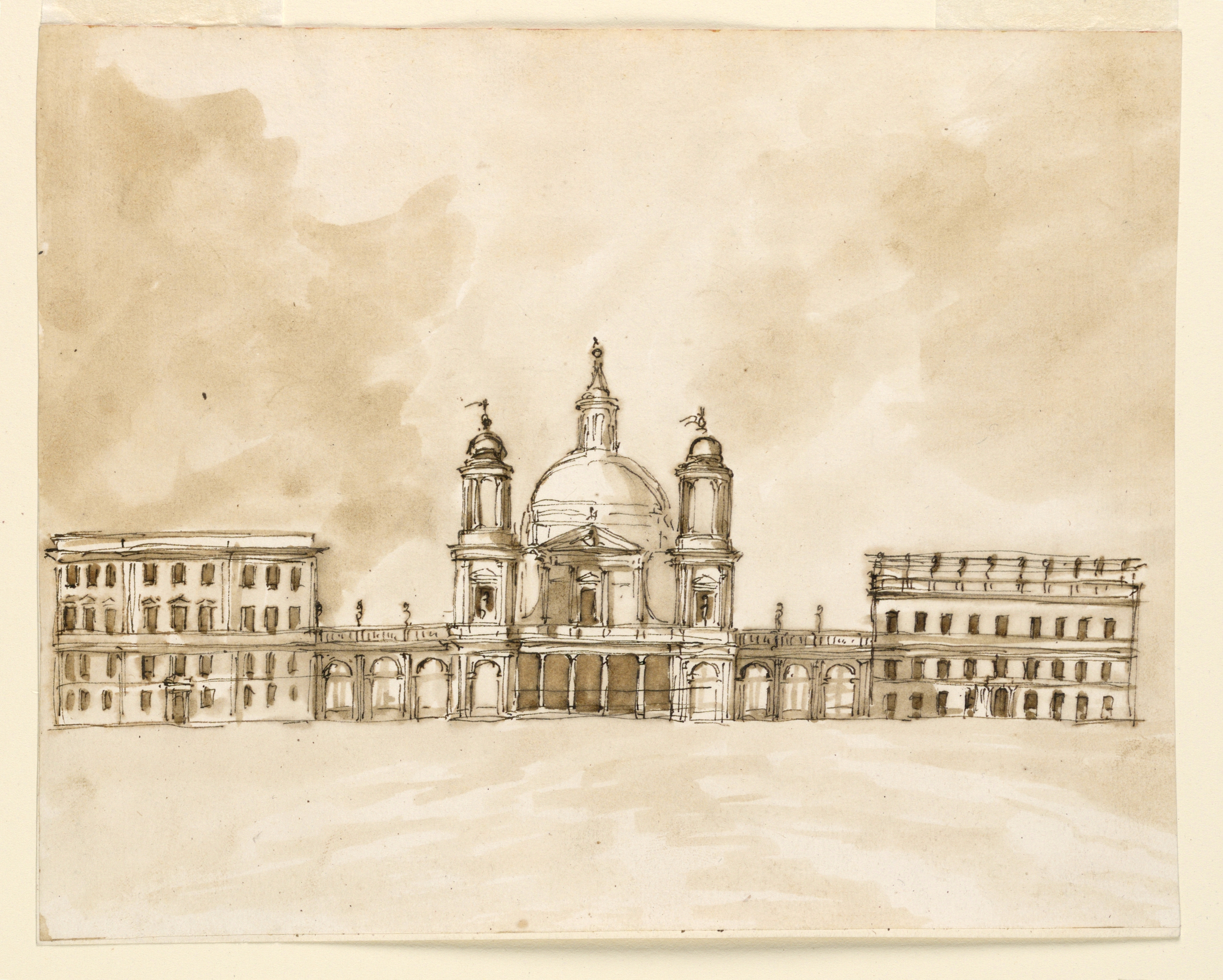 Drawing, Elevation of a Church Flanked by Two Houses; Designed by Giuseppe Barberi (Italian, 1746–1809); Italy; pen and brown ink, brush and brown wash, graphite on off-white laid paper; Image: 19.9 x 24.7 cm (7 13/16 x 9 3/4 in.); Museum purchase through gift of various donors and from Eleanor G. Hewitt Fund; 1938-88-1556
