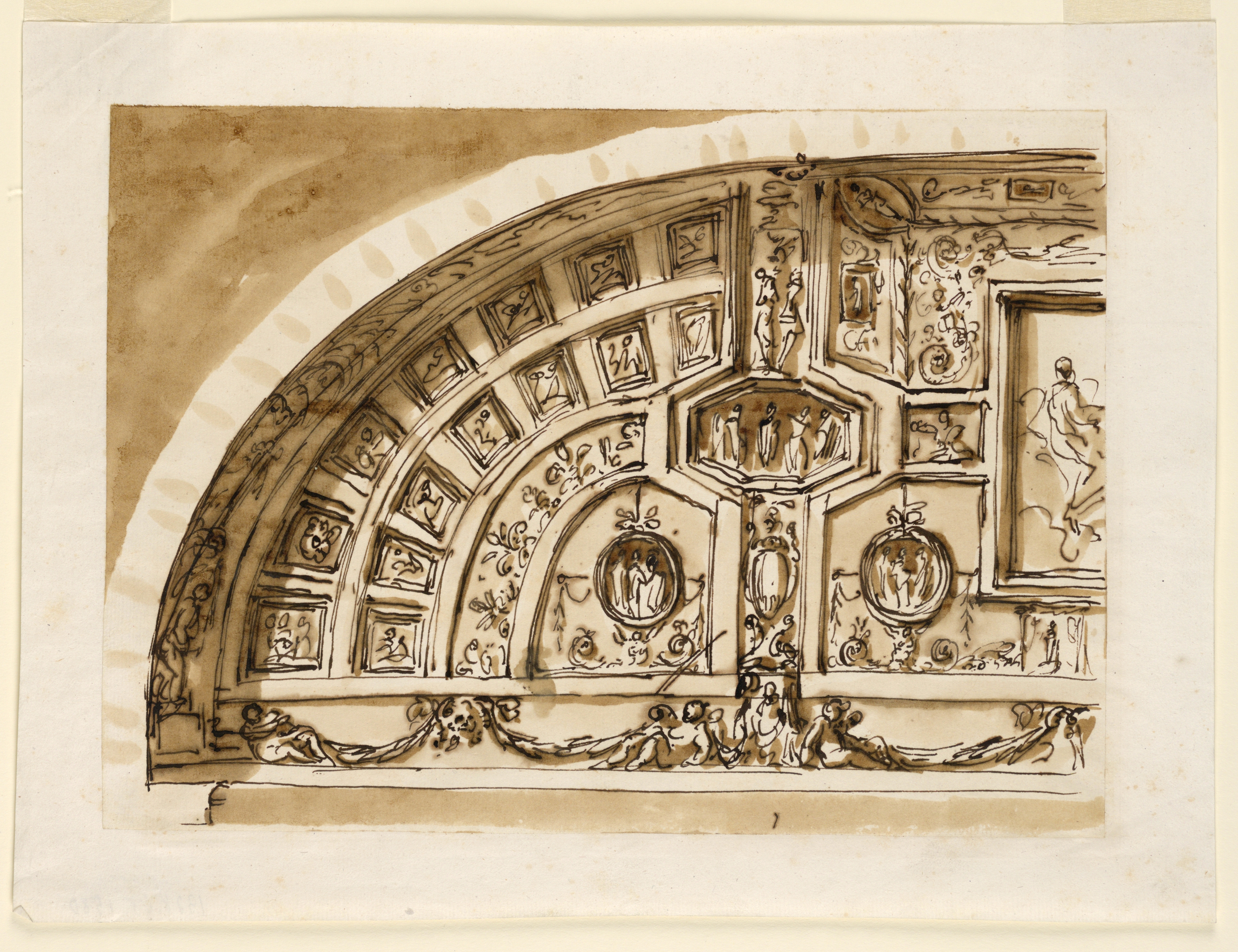 Drawing, Design for Ceiling Decoration; Designed by Giuseppe Barberi (Italian, 1746–1809); Italy; pen and brown ink, brush and brown wash on off-white laid paper, lined; Image: 20.1 x 27.8 cm (7 15/16 x 10 15/16 in.); Museum purchase through gift of various donors and from Eleanor G. Hewitt Fund; 1938-88-1580