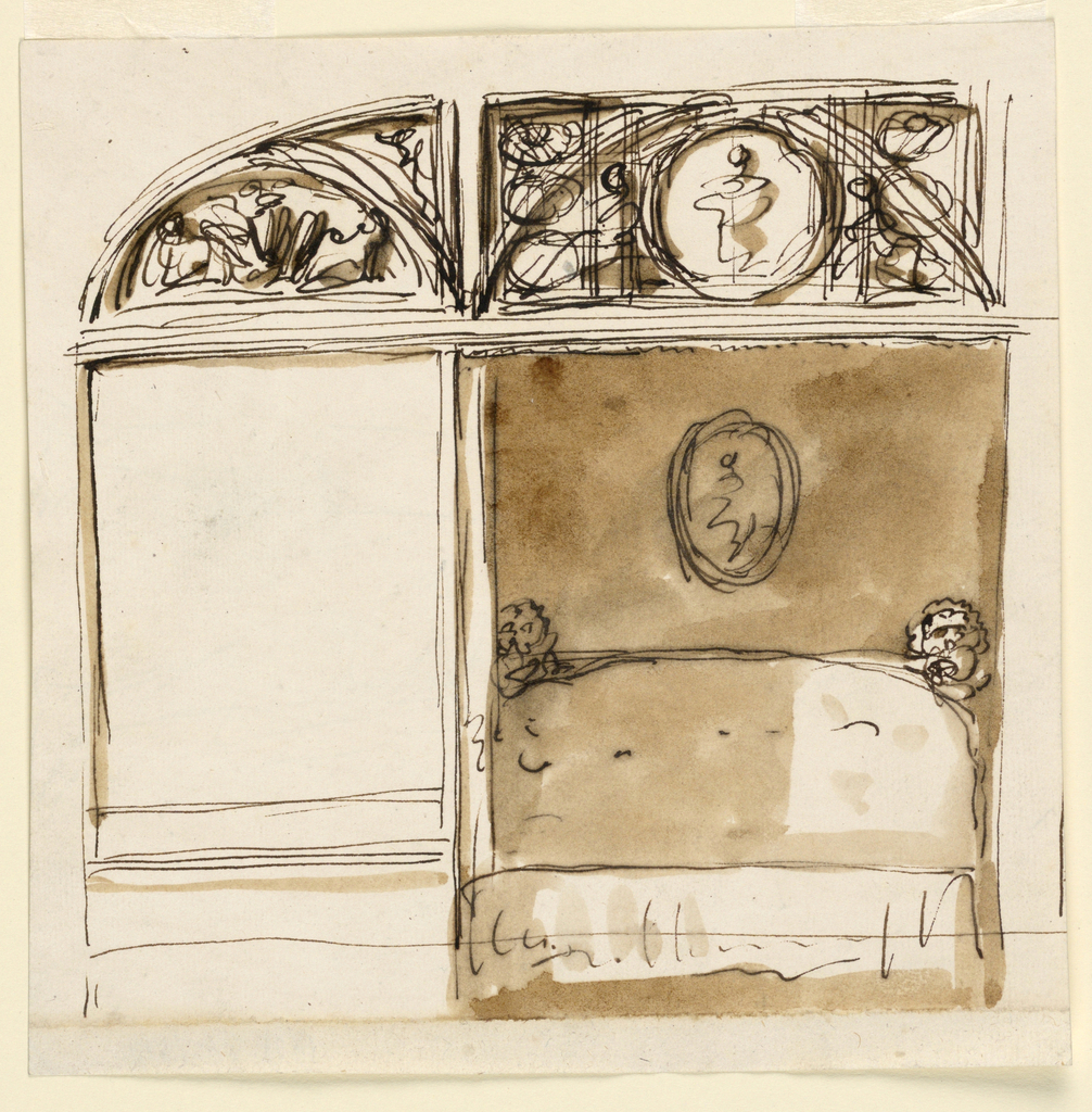 Drawing, Design for a Bedroom Alcove; Designed by Giuseppe Barberi (Italian, 1746–1809); Italy; pen and brown ink, brush and brown wash on off-white laid paper, lined; Image: 18.1 x 19.1 cm (7 1/8 x 7 1/2 in.); Museum purchase through gift of various donors and from Eleanor G. Hewitt Fund; 1938-88-1613