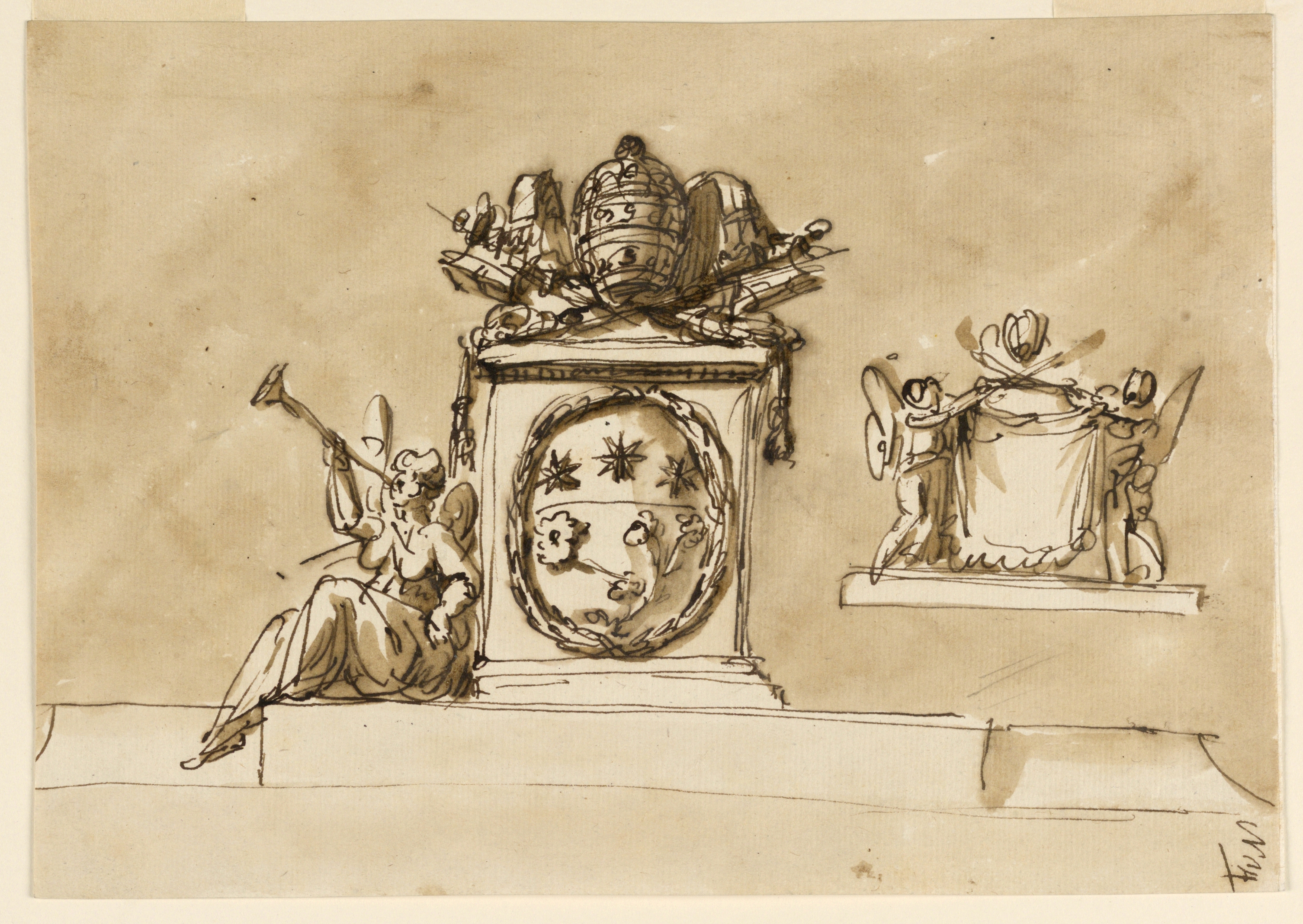 Drawing, Coat of arms of Pope Pius VI; Designed by Giuseppe Barberi (Italian, 1746–1809); Italy; pen and brown ink, brush and brown wash; Image: 17.1 x 24.3 cm (6 3/4 x 9 9/16 in.); Museum purchase through gift of various donors and from Eleanor G. Hewitt Fund; 1938-88-1823