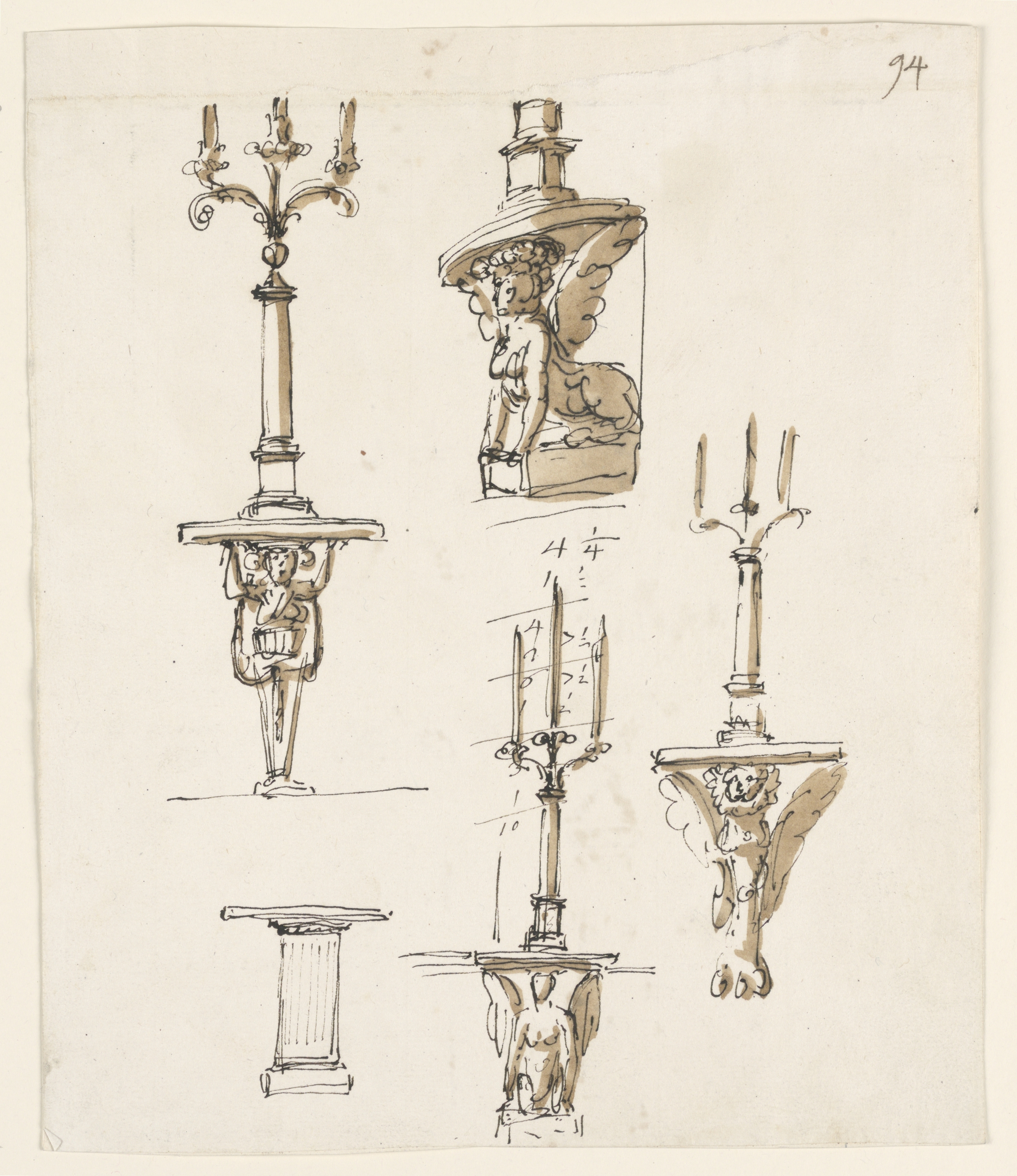 Drawing, Designs for Five Console Tables, Three with Candlesticks, Probably for Rooms in the Palazzo Altieri, Rome; Designed by Giuseppe Barberi (Italian, 1746–1809); Italy; pen and brown ink, brush and brown wash on off-white laid paper, lined; Image: 22 x 19.8 cm (8 11/16 x 7 13/16 in.); Museum purchase through gift of various donors and from Eleanor G. Hewitt Fund; 1938-88-2014