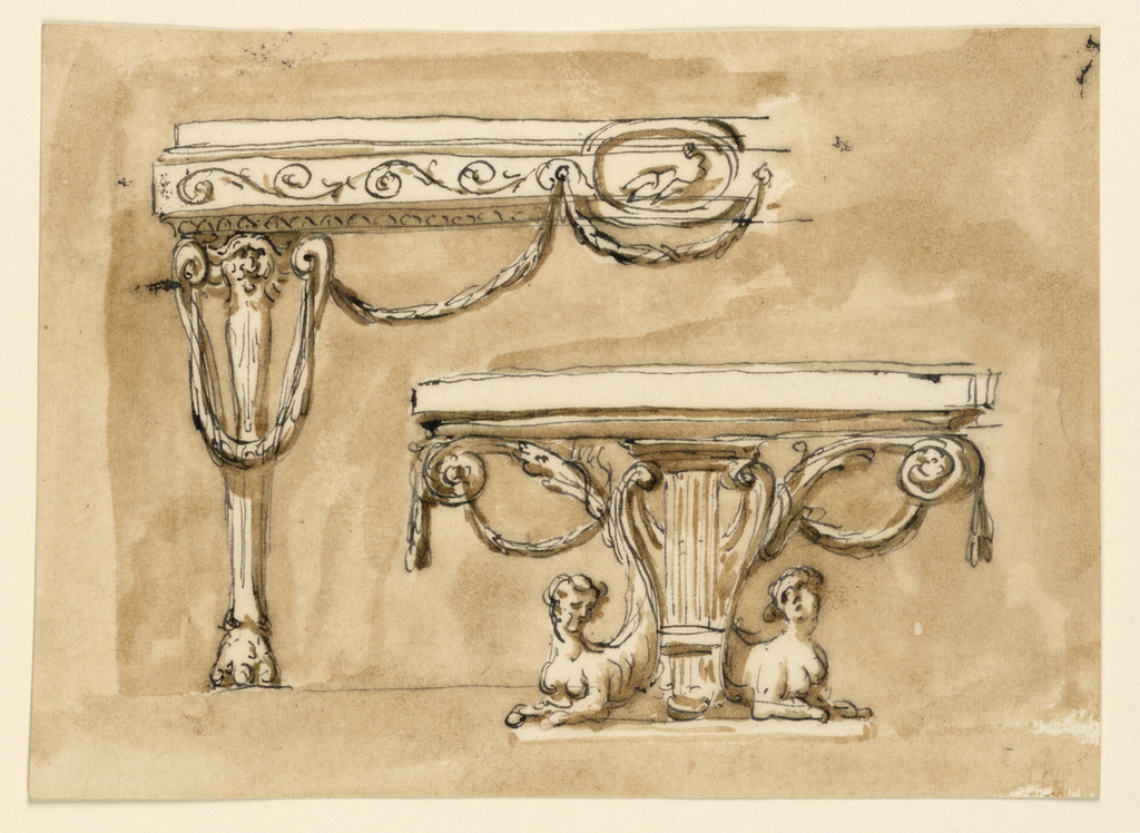 Drawing, Console tables; Architect: Giuseppe Barberi (Italian, 1746–1809); Italy; pen and brown ink, brush and brown wash on off-white laid paper; Image: 16.1 x 22.3 cm (6 5/16 x 8 3/4 in.); Museum purchase through gift of various donors and from Eleanor G. Hewitt Fund; 1938-88-2084