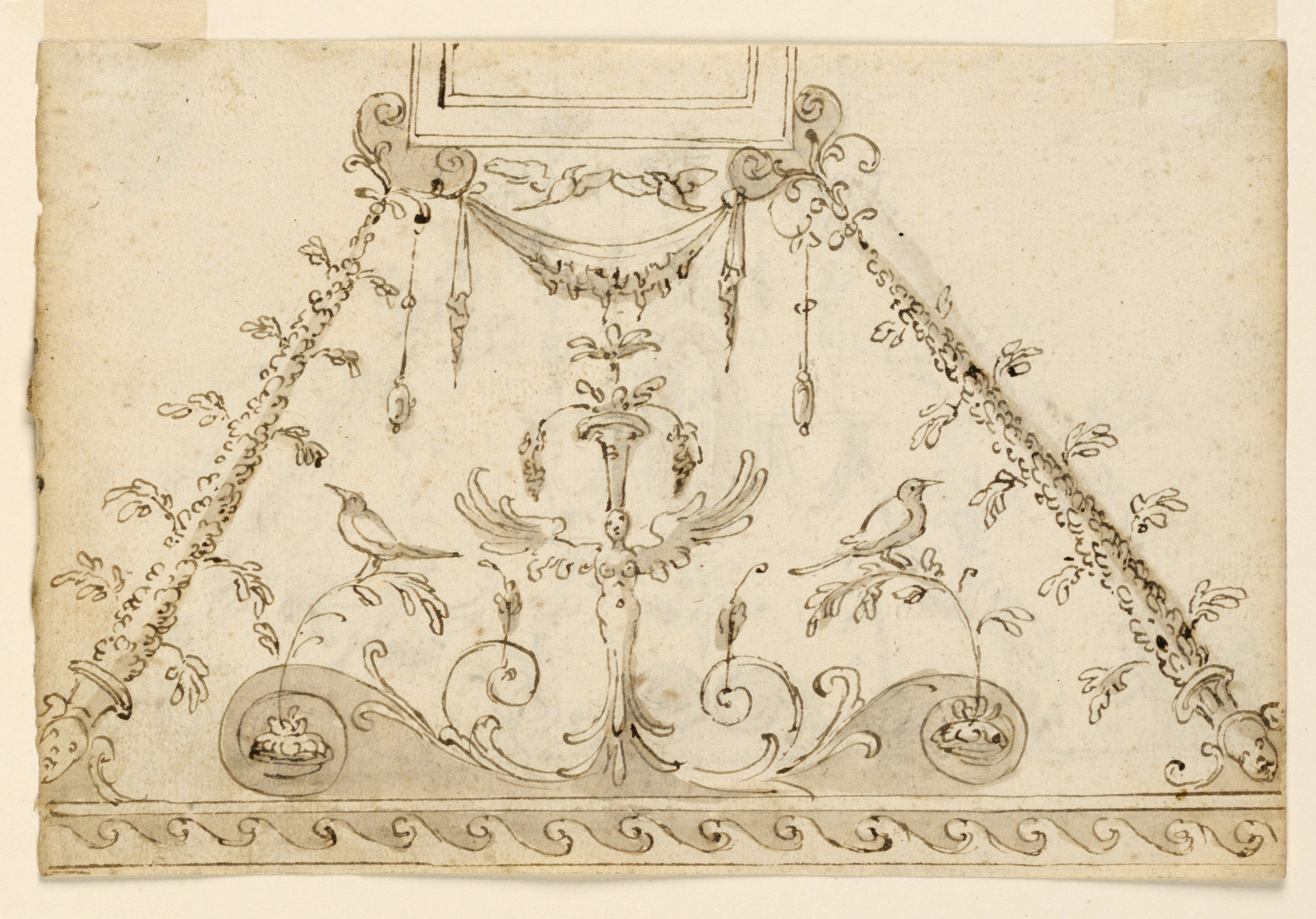 Drawing, Two Projects for Painted Grotesque Decorations of a Ceiling; Italy; charcoal, pen and ink, brush and greyish-brown watercolor on laid paper.; H x W: 14.8 × 22.1 cm (5 13/16 × 8 11/16 in.); Museum purchase through gift of various donors and from Eleanor G. Hewitt Fund; 1938-88-2615