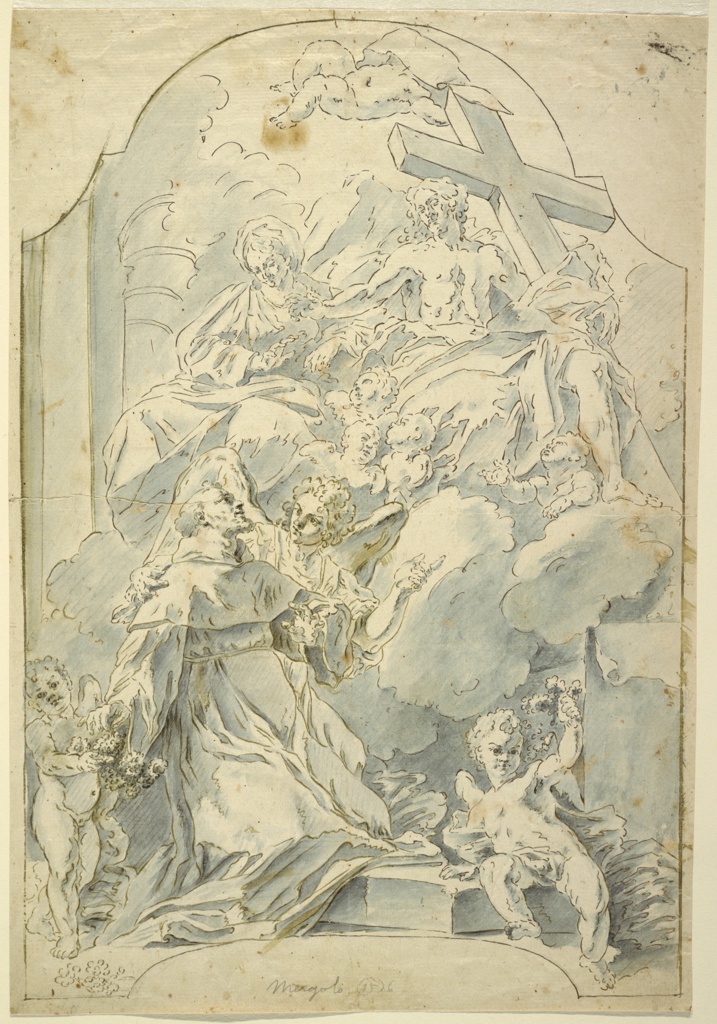 Drawing, A Saint's Vision of the Cross; Designed by Francesco Saverio Mergolo (Italian, 1746–1786); Italy; pen and brown ink on paper; 42 x 28.5 cm (16 9/16 x 11 1/4 in.); Museum purchase through gift of various donors and from Eleanor G. Hewitt Fund; 1938-88-5669