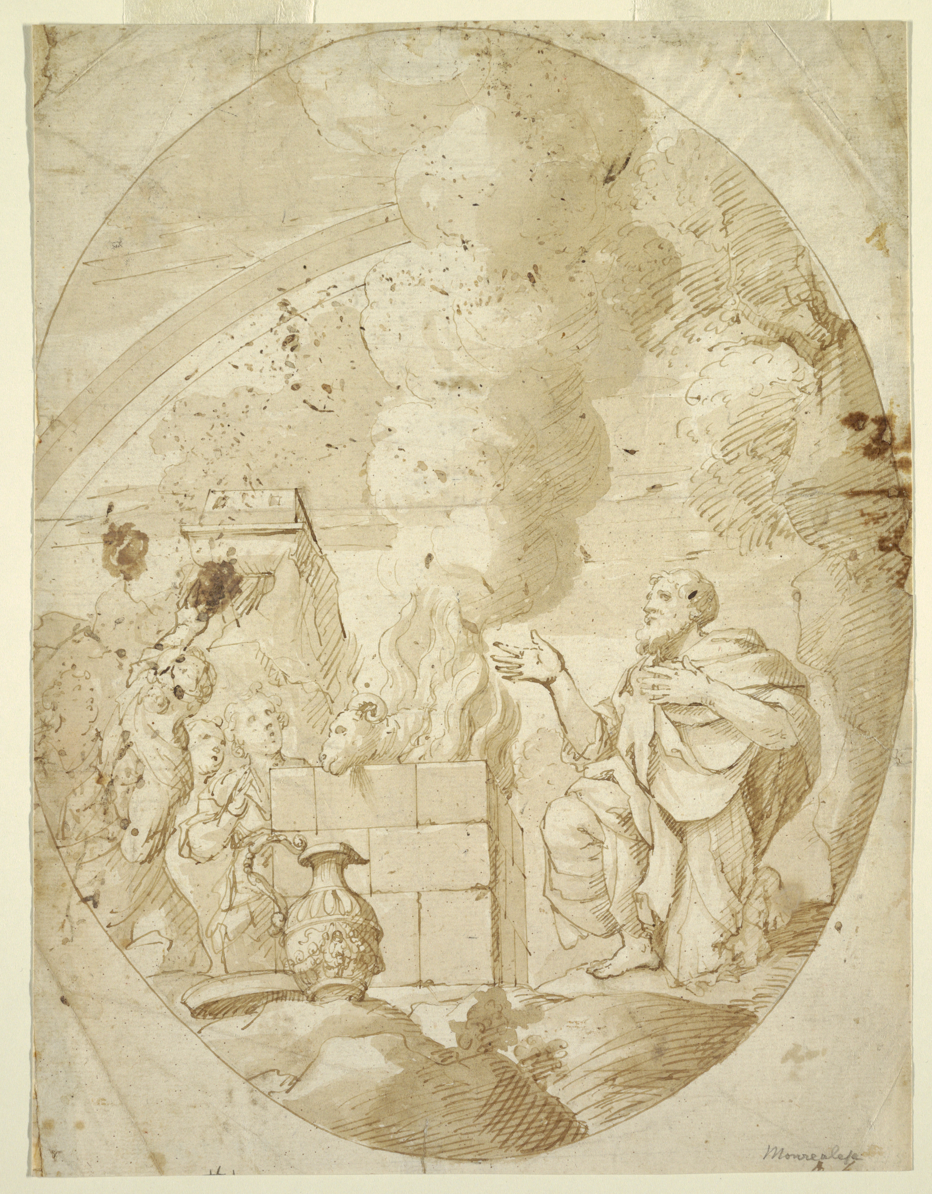 Drawing, Sacrifice of Noah; Pietro Novelli (Italian, 1603 - 1647); Italy; brush and brown wash, pen and ink on white laid paper; 33.9 x 25.8 cm (13 3/8 x 10 3/16 in.); Museum purchase through gift of various donors and from Eleanor G. Hewitt Fund; 1938-88-8324