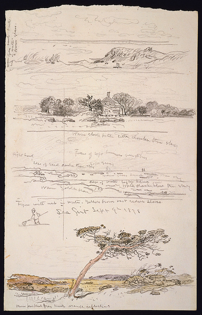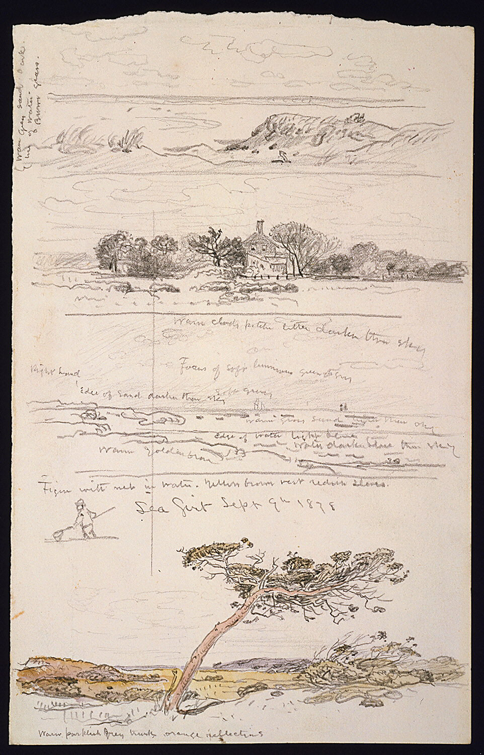 Recto: in graphite upper left margin: warm gray sand dune/ [illeg.] of water/ brown grass. At center: warm clouds [? ] little darker than sky / Forms or soft luminous green to gray/ soft gray/edge of sand darker than sky/ warm gray sand/edge of water light blue/water darker blue than sky/warm green brown; Figure with net in water/ reddish brown vest reddish brown shoes./ Sea Girt. Sept.9th 1878. Across bottom of sheet: warm purplish grey trunk orange reflections Verso: Inscribed in graphite, lower middle, towards left: Sea Girt Cedars./ Sept 10th 1878. Middle bottom: Bay / Rich yellow green.