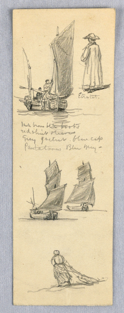 Inscribed in graphite, upper right: Etratat.; upper center, on sail: Brown; center: Dark brown blk boots / red shirt sleeves / grey jacket, blue cap / Pantaloans Blue grey - Verso: Inscribed in graphite, upper right: Bellenhock Stock and Alp / Interlaken July 21st.; lower left, with date: Interlacken